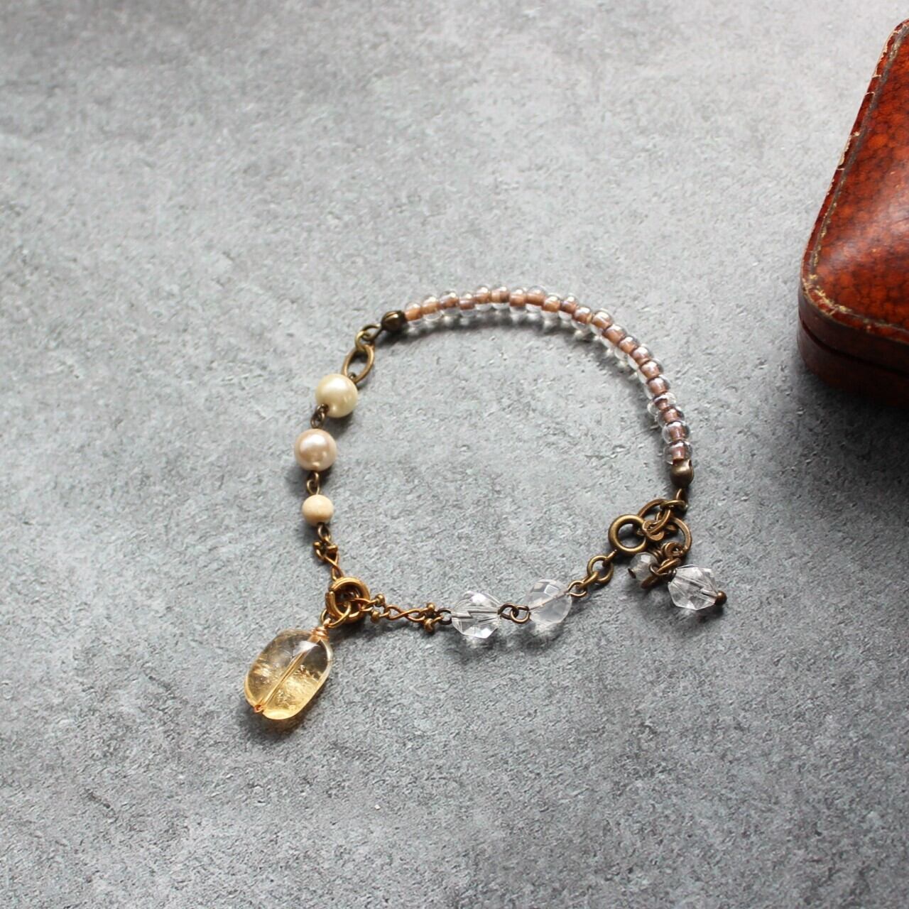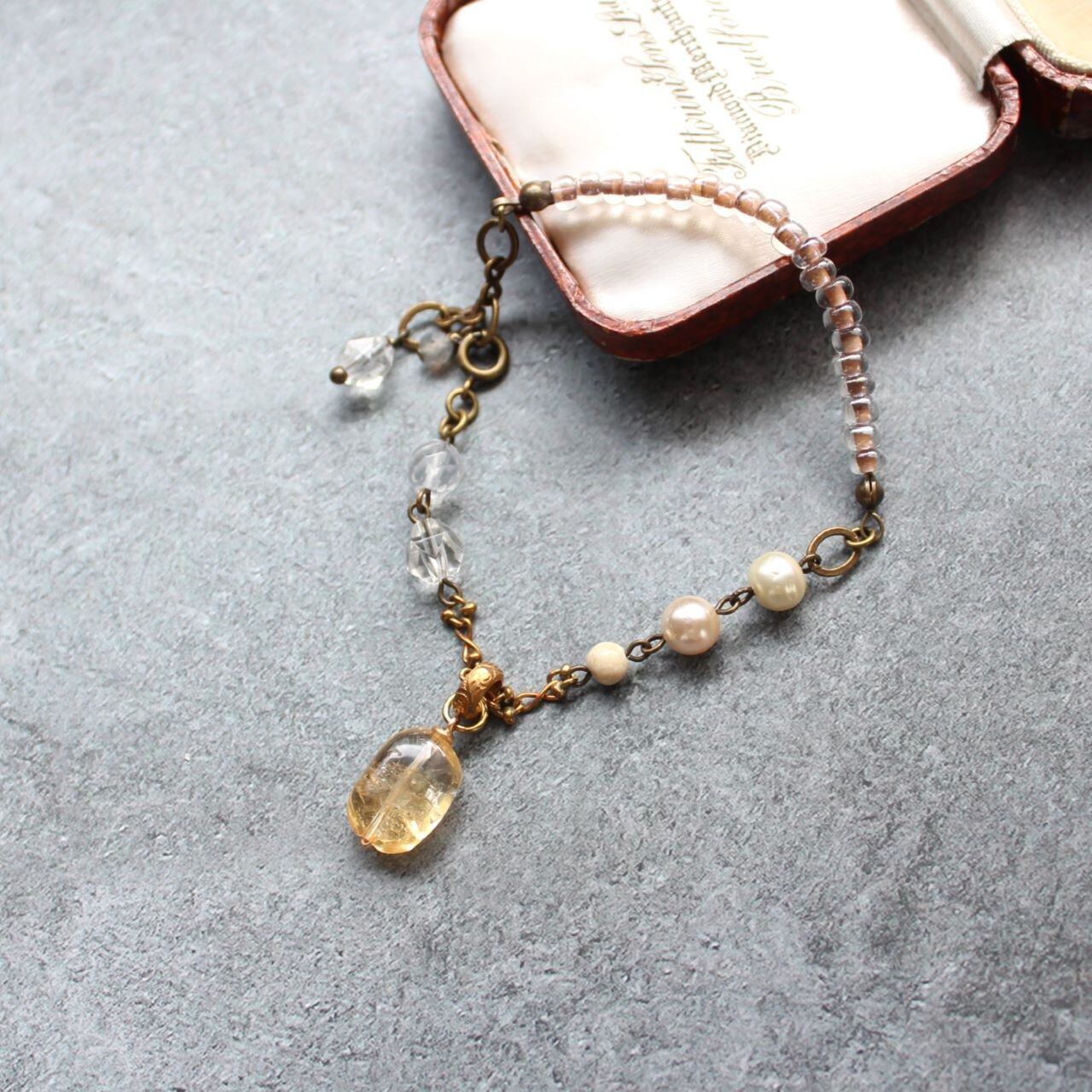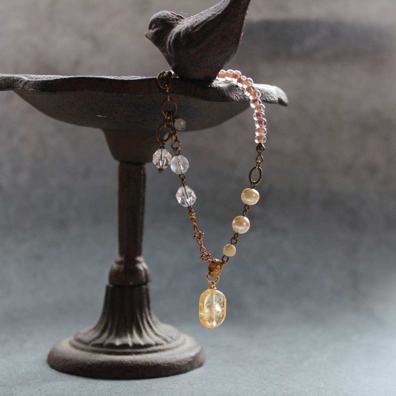 小さなネックレスのようなブレスレット シトリン・クリスタル・大粒シードビーズ サンドベージュ色