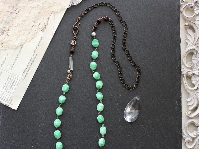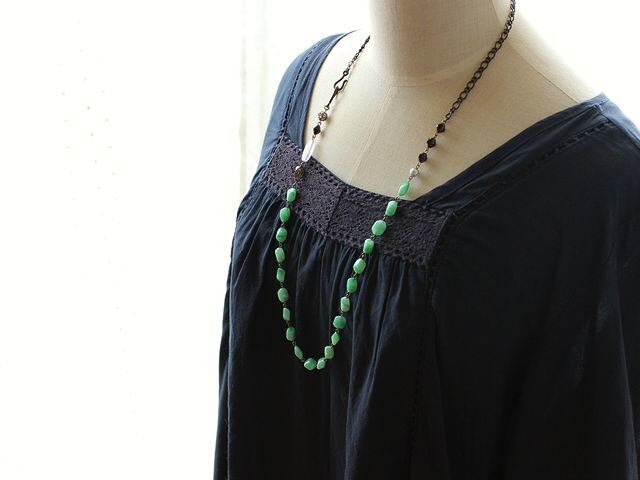 メインに使っているグリーンのガラスビーズは、マーブルにすじの模様が入っていて、いかにもヴィンテージ、といった風貌のビーズです。