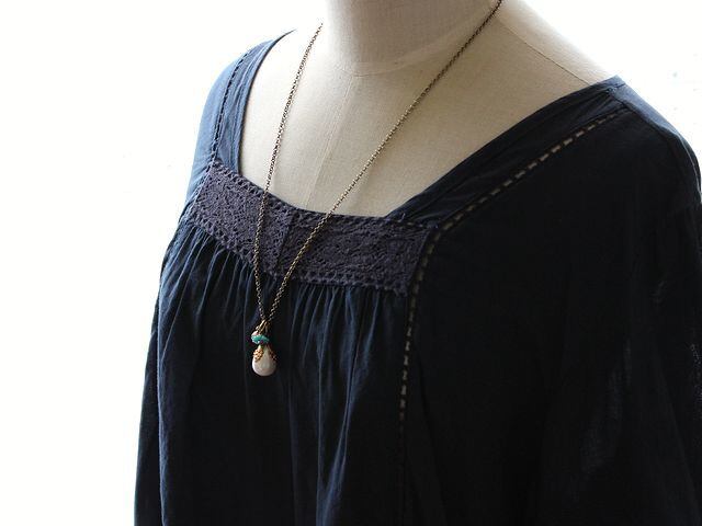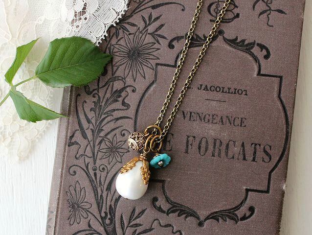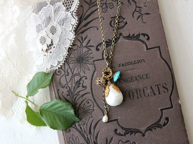 高級感のある貝パールをメインに、1940年代のヴィンテージの青いガラスの花、アンティークゴールド色のフィリグリーボールを合わせた、ちょっと楽しいネックレスです。