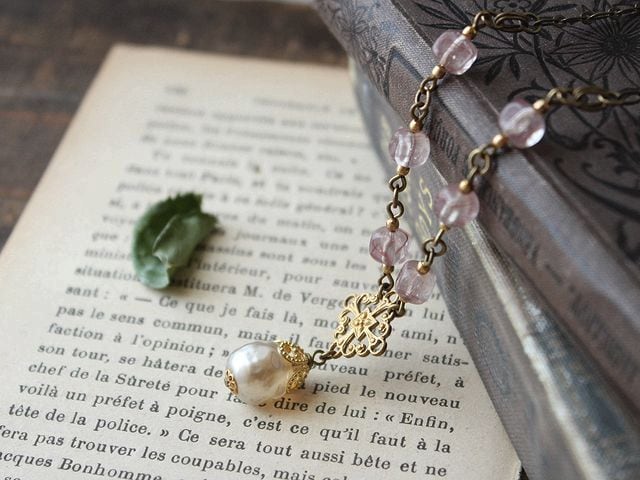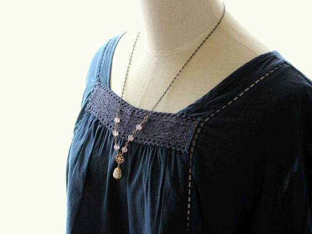 本当に稀少です!半透明のミリアムハスケルのNIKIパールと真鍮フィリグリー 花びら色のネックレス
