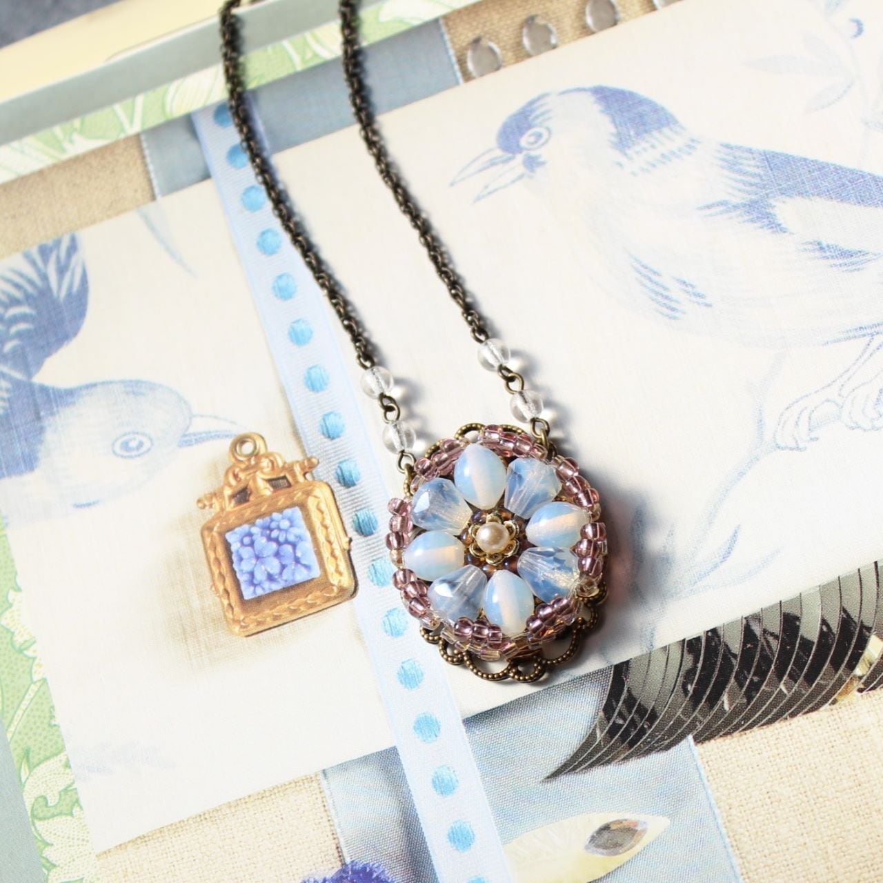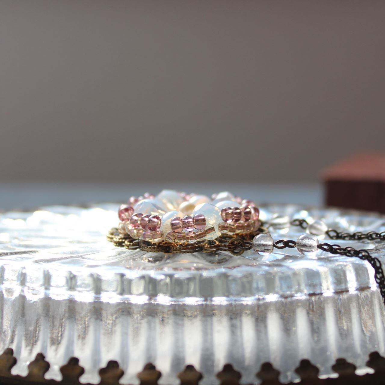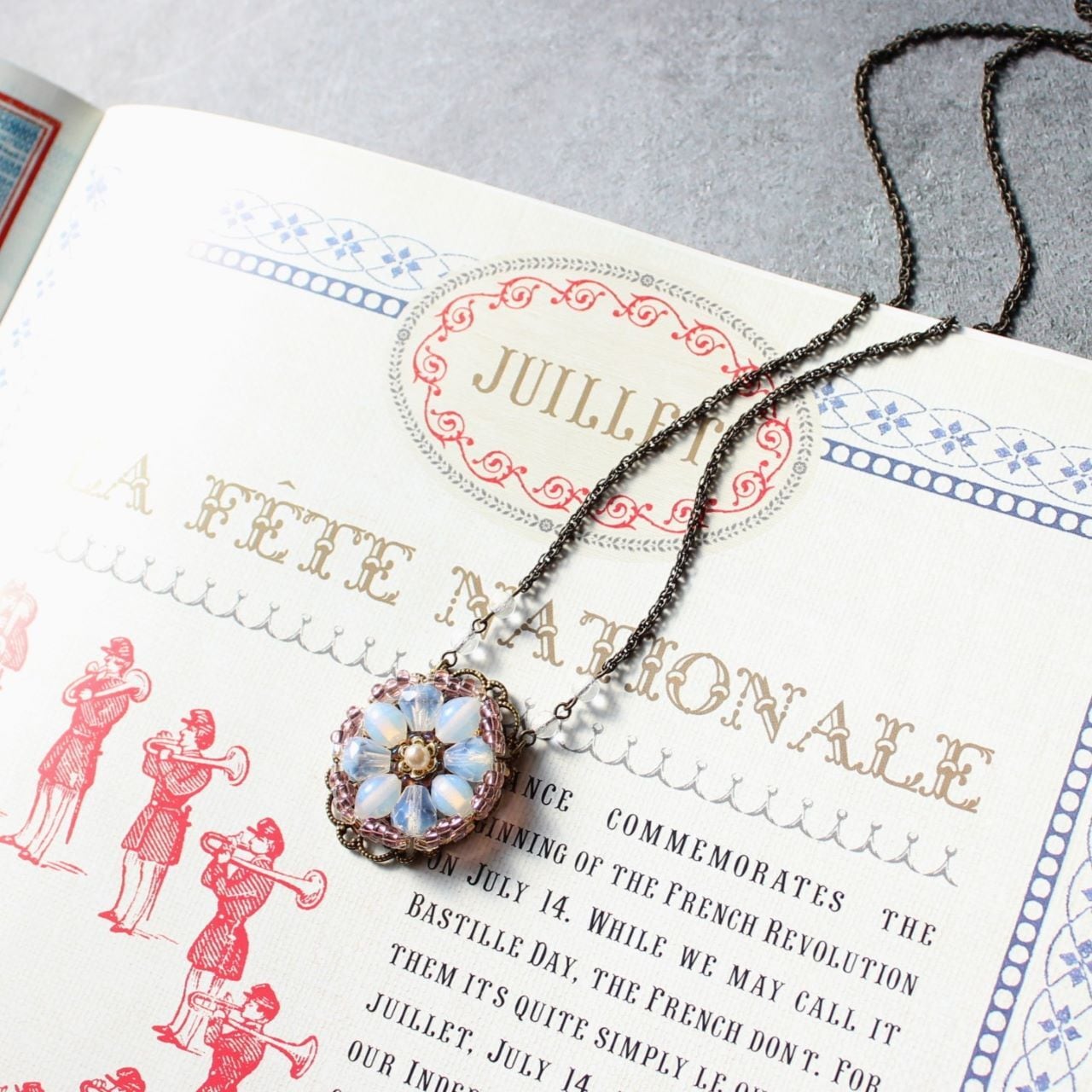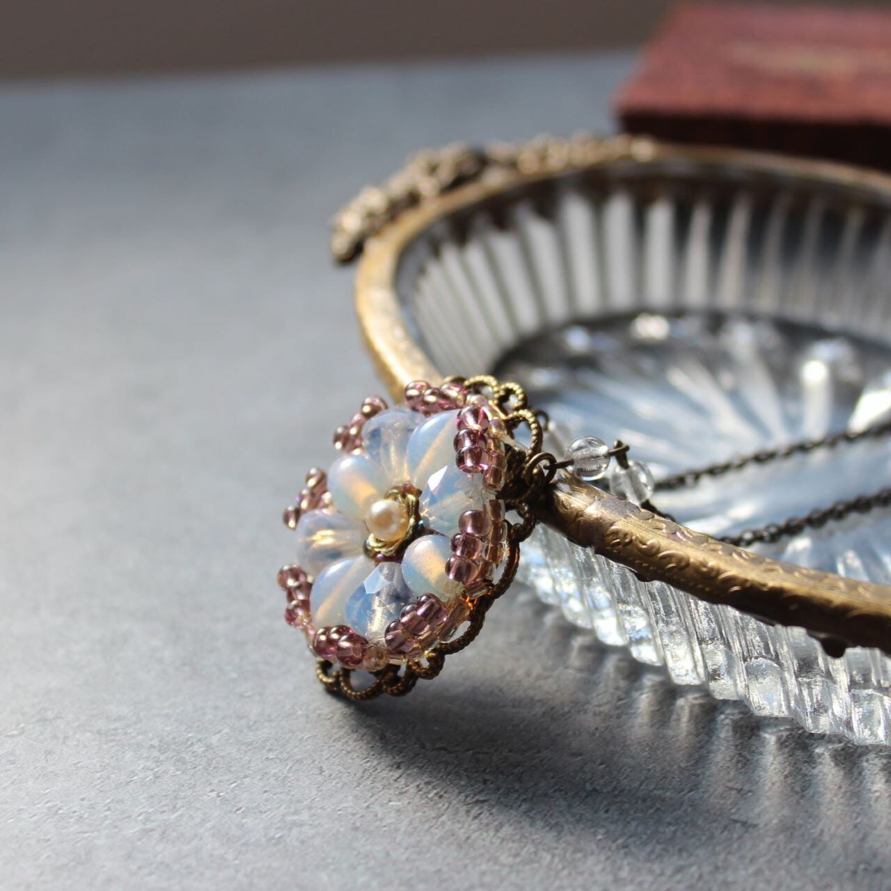 モチーフは、ドイツのヴィンテージ・ギブレビーズと、乳白色のヴィンテージビーズ。そして中心には、日本の古いヴィンテージ・ガラスパールを。