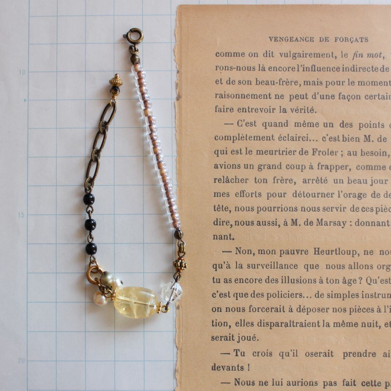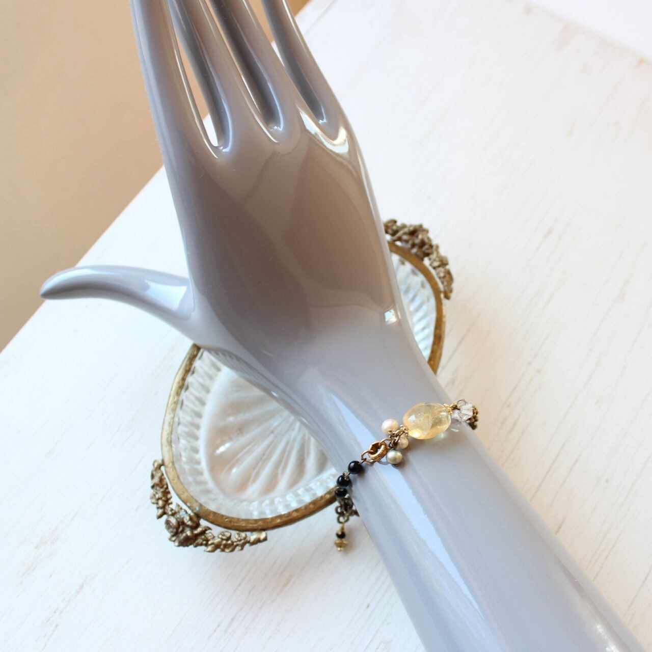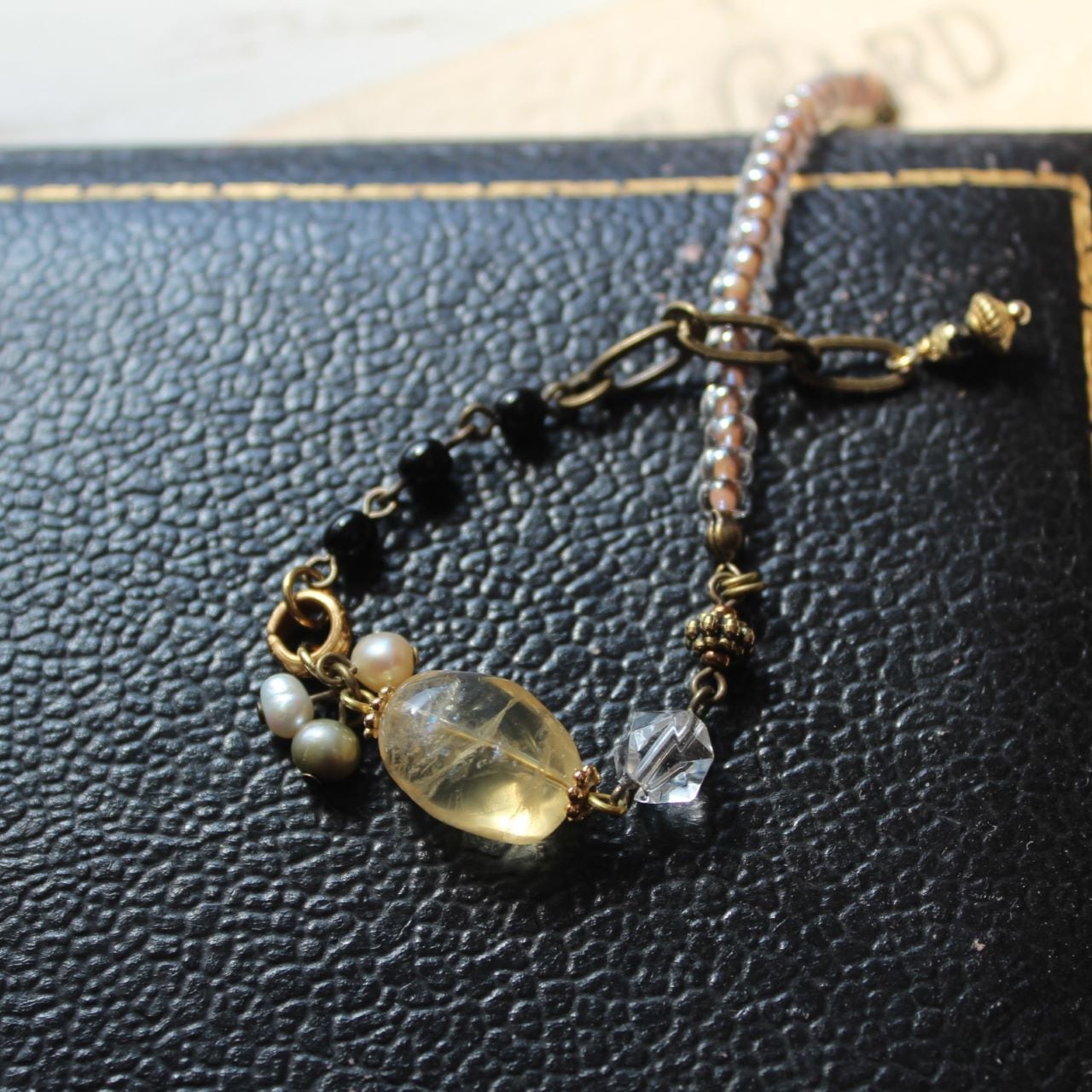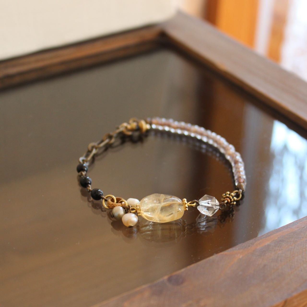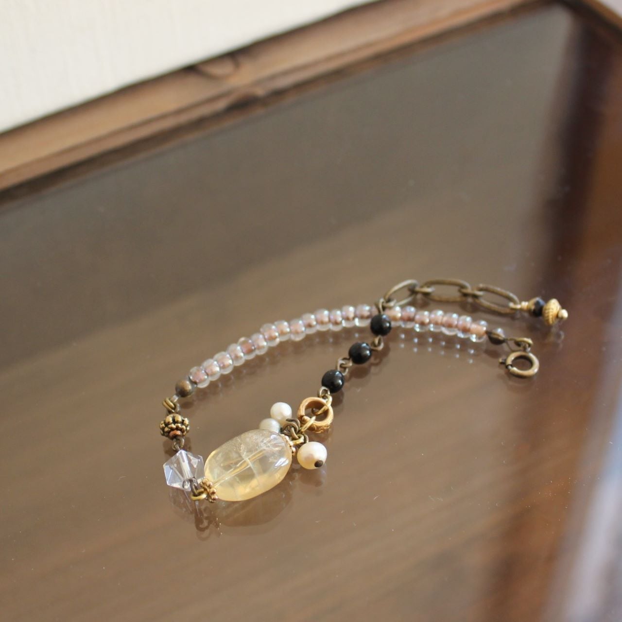 シトリンと水晶、淡水パール 大粒シードビーズのシックなブレスレット