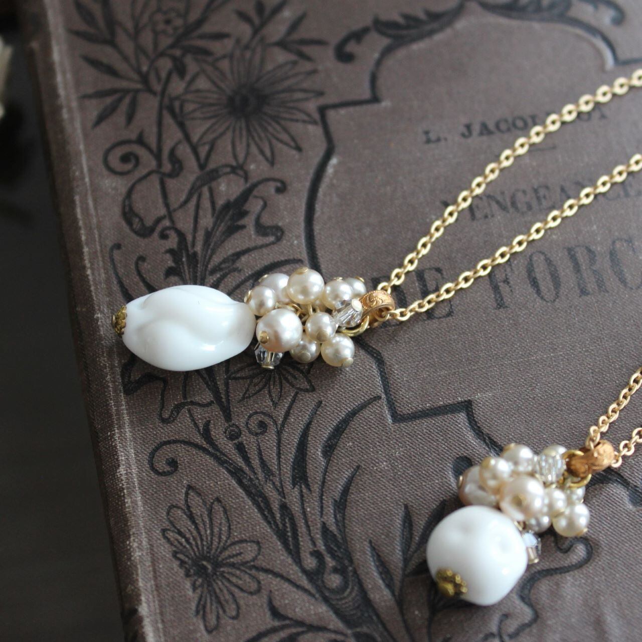 そんな素材たちを用いて、ヴィンテージ・コスチュームジュエリーの面影を感じるペンダント・ネックレスに仕立てました。