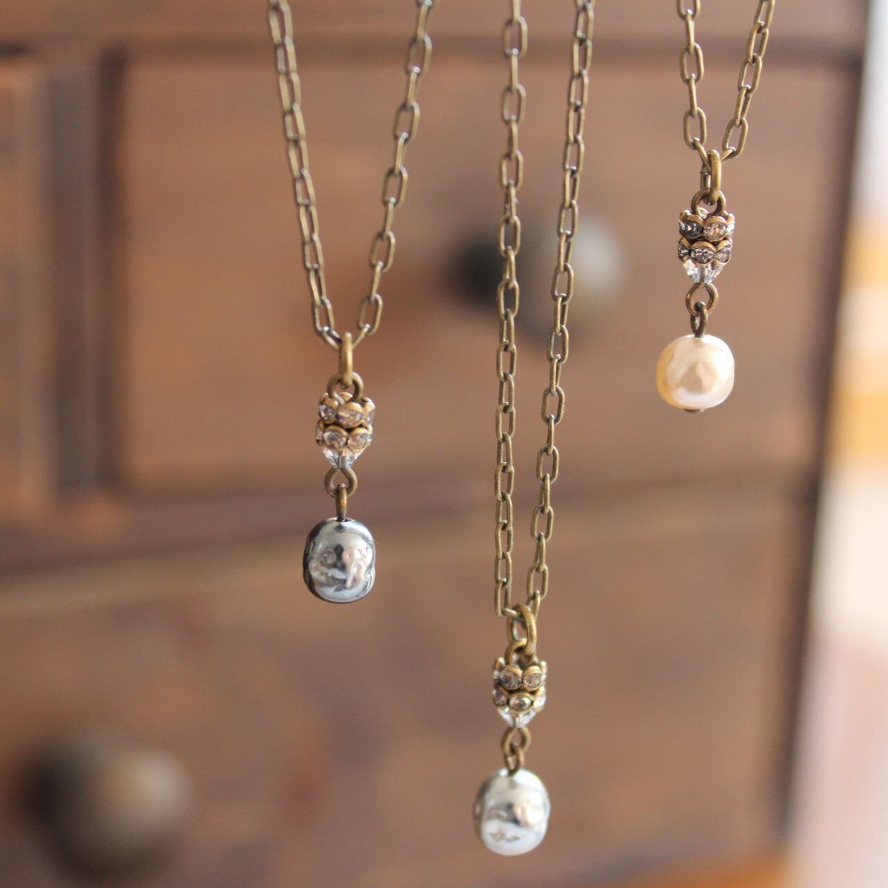 そんな、美しいパールを更に引き立てるように、ラインストーンとスワロフスキークリスタルの煌めきをあしらい、小さなペンダントに仕立てました。