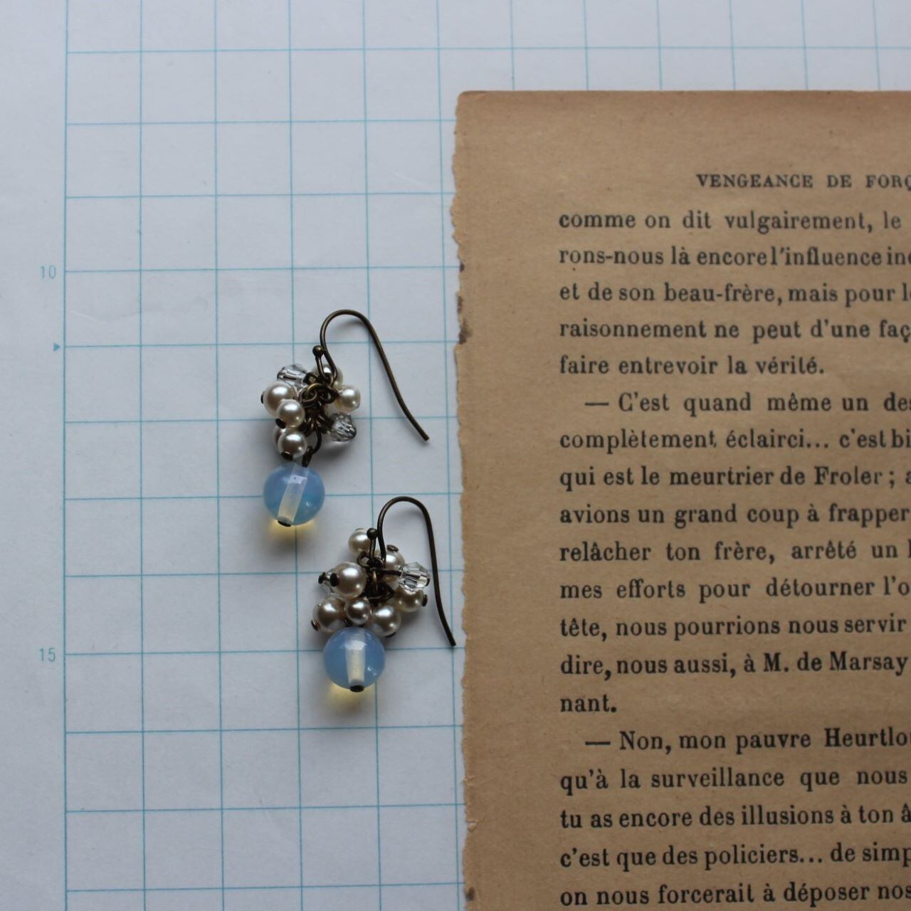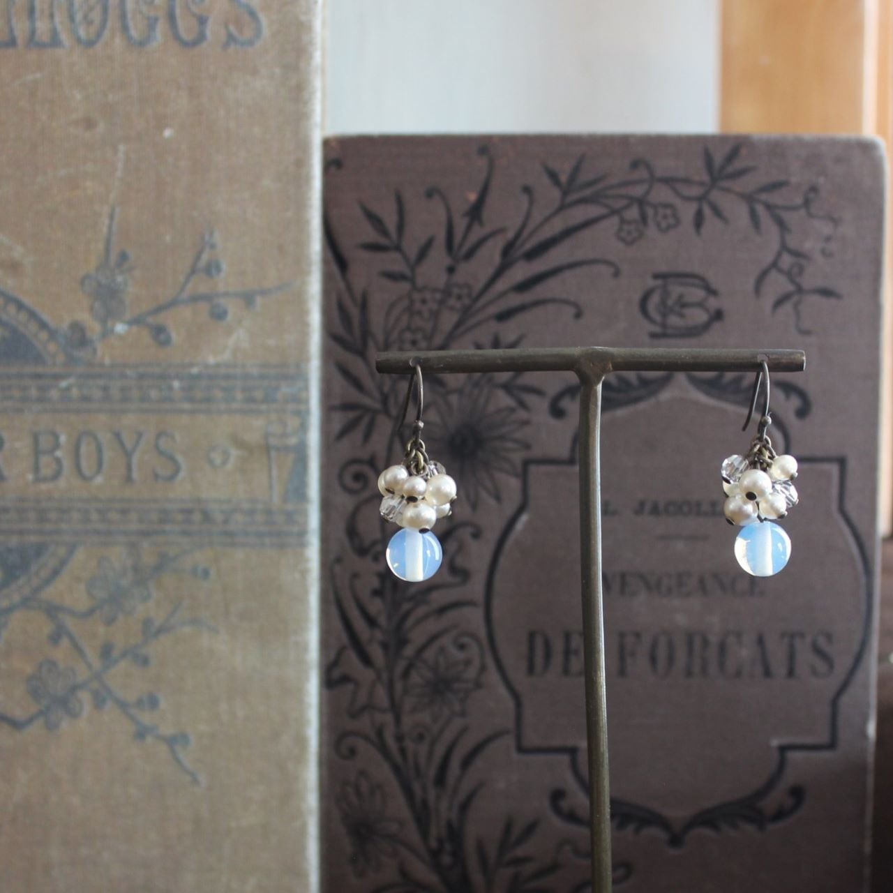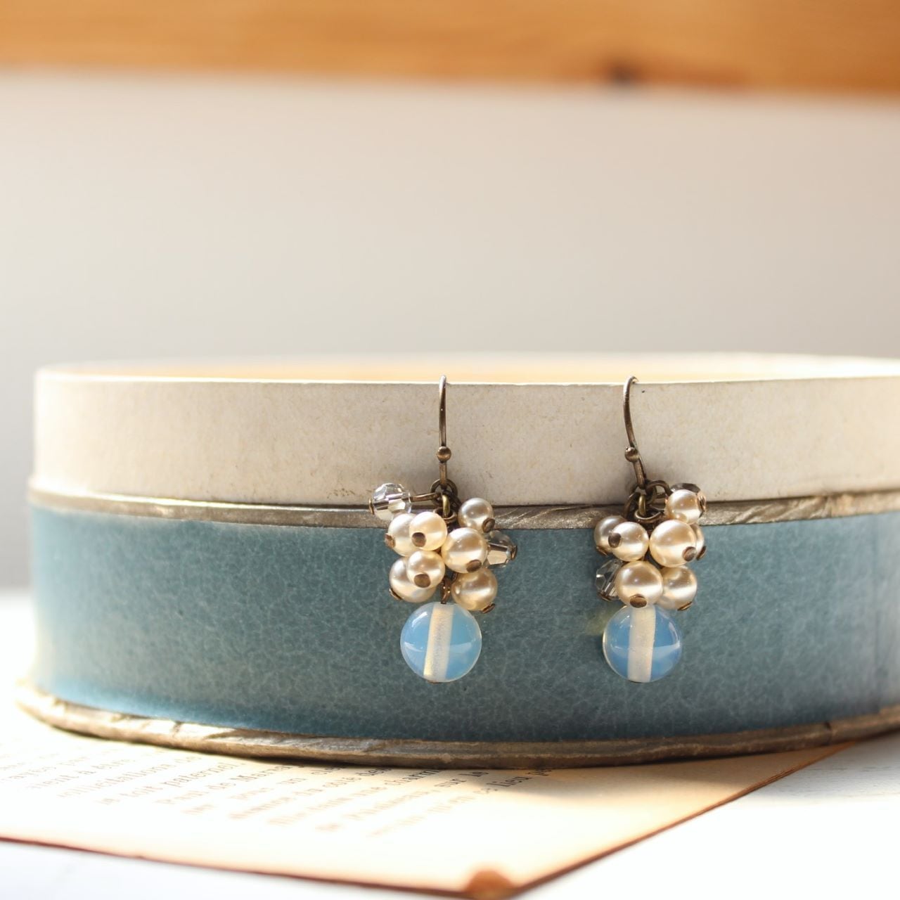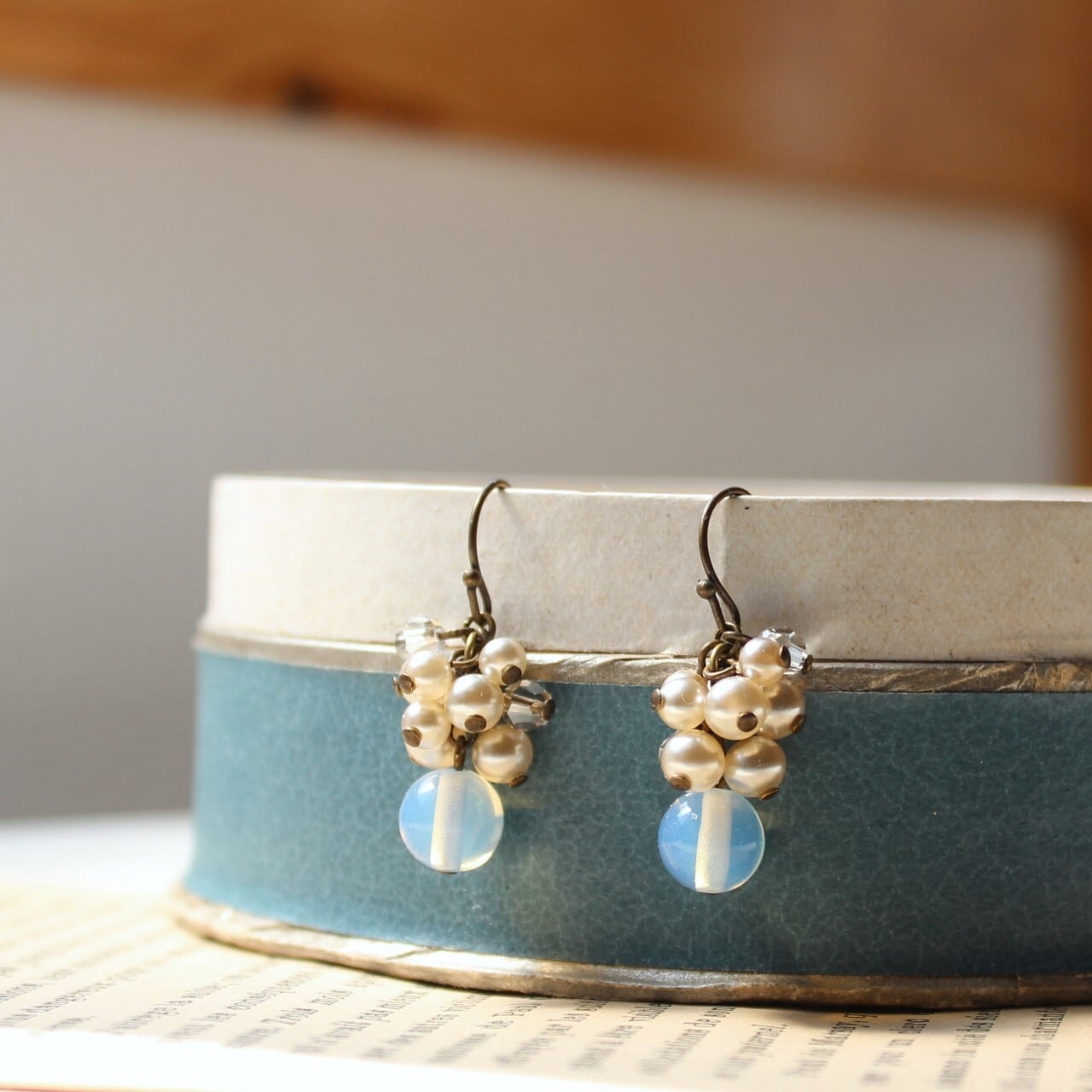その下に揺らせた乳白色のガラスビーズは、ほんのりブルーかかっていて、優し気な表情が魅力です。