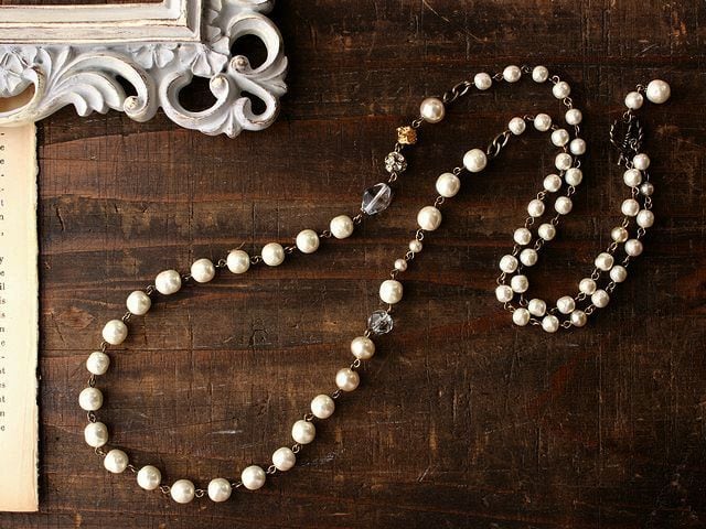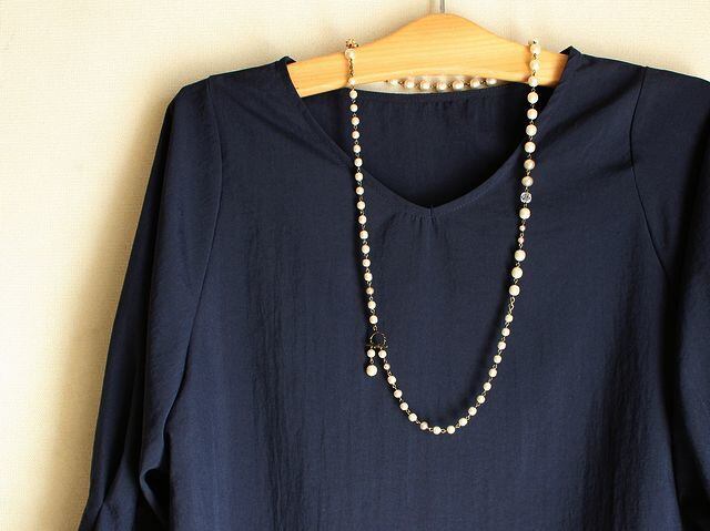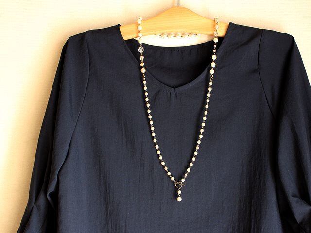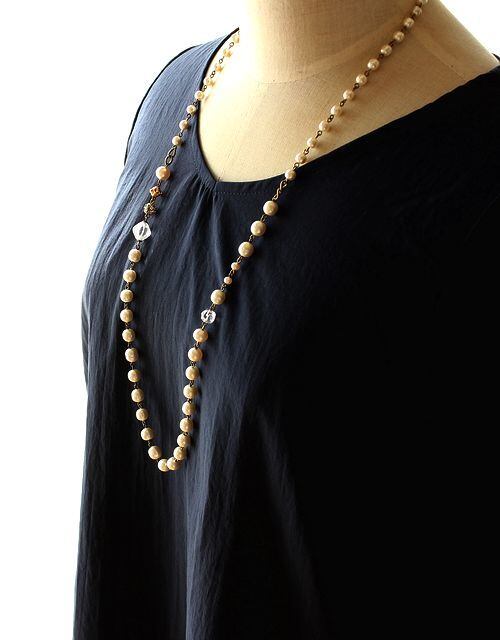 着け方次第でいろいろな表情が楽しめる、ガラスパール・ロングネックレス。