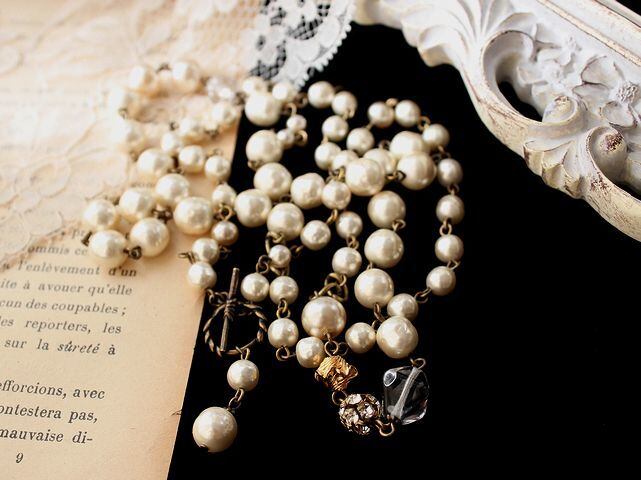 そんなこだわりのガラスパールをメインに完成させたロングネックレス、ところどころにヴィンテージガラスパールやヴィンテージビーズ、真鍮ビーズなどを散りばめ、着けた時に美しいと感じるバランスにこだわって、完成させました。