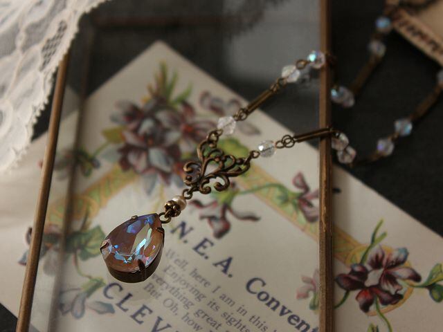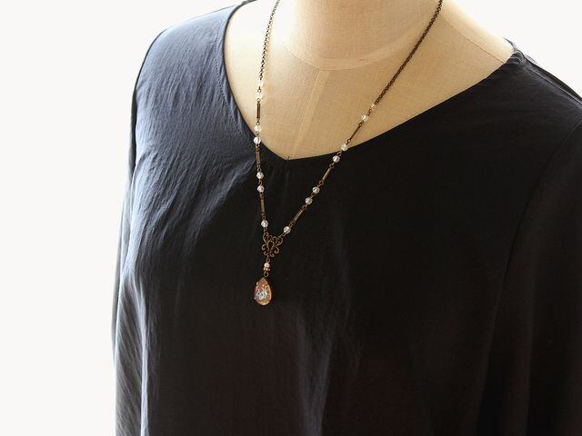 ティアドロップ型のスワロフスキーをアンティークスタイルに仕上げたネックレスです。