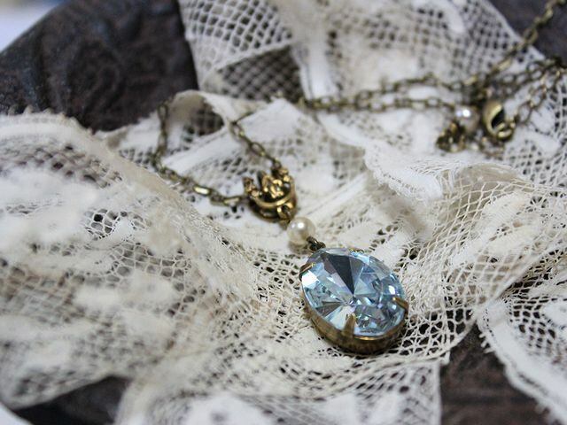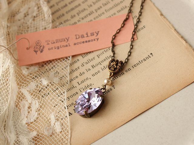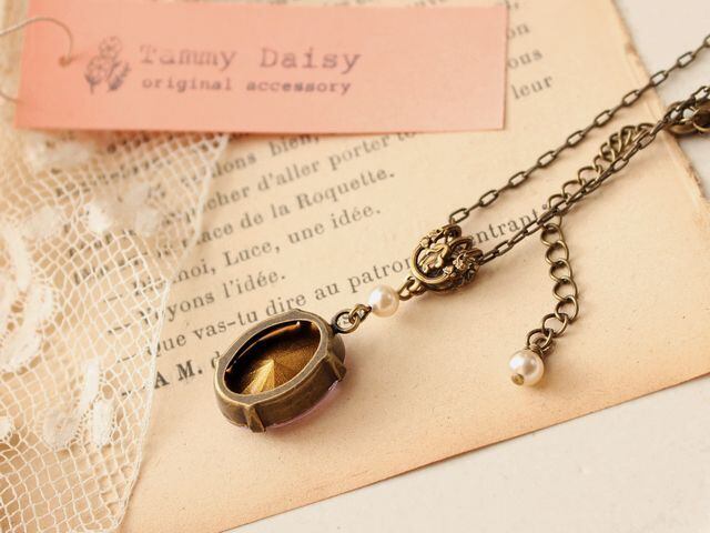 そんな不思議で美しいアレキサンドライト・クリスタルには、ヴィンテージの小さなガラスパールをあしらい、ローズの蕾の透かし模様が美しい、海外から取り寄せたフィリグリーバチカンを合わせてエレガントなネックレスに仕立てました。