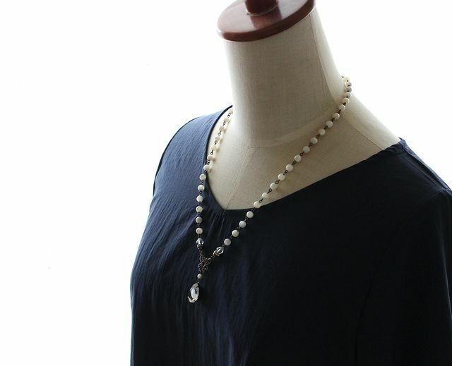 存在感のあるネックレスですので、合わせるお洋服は、ワンピースや、それに近い丈のお洋服など、少し長めのトップスに着けていただくと、お洋服とネックレスが美しいハーモニーを奏でる、素敵なバランスになりやすいように思います。