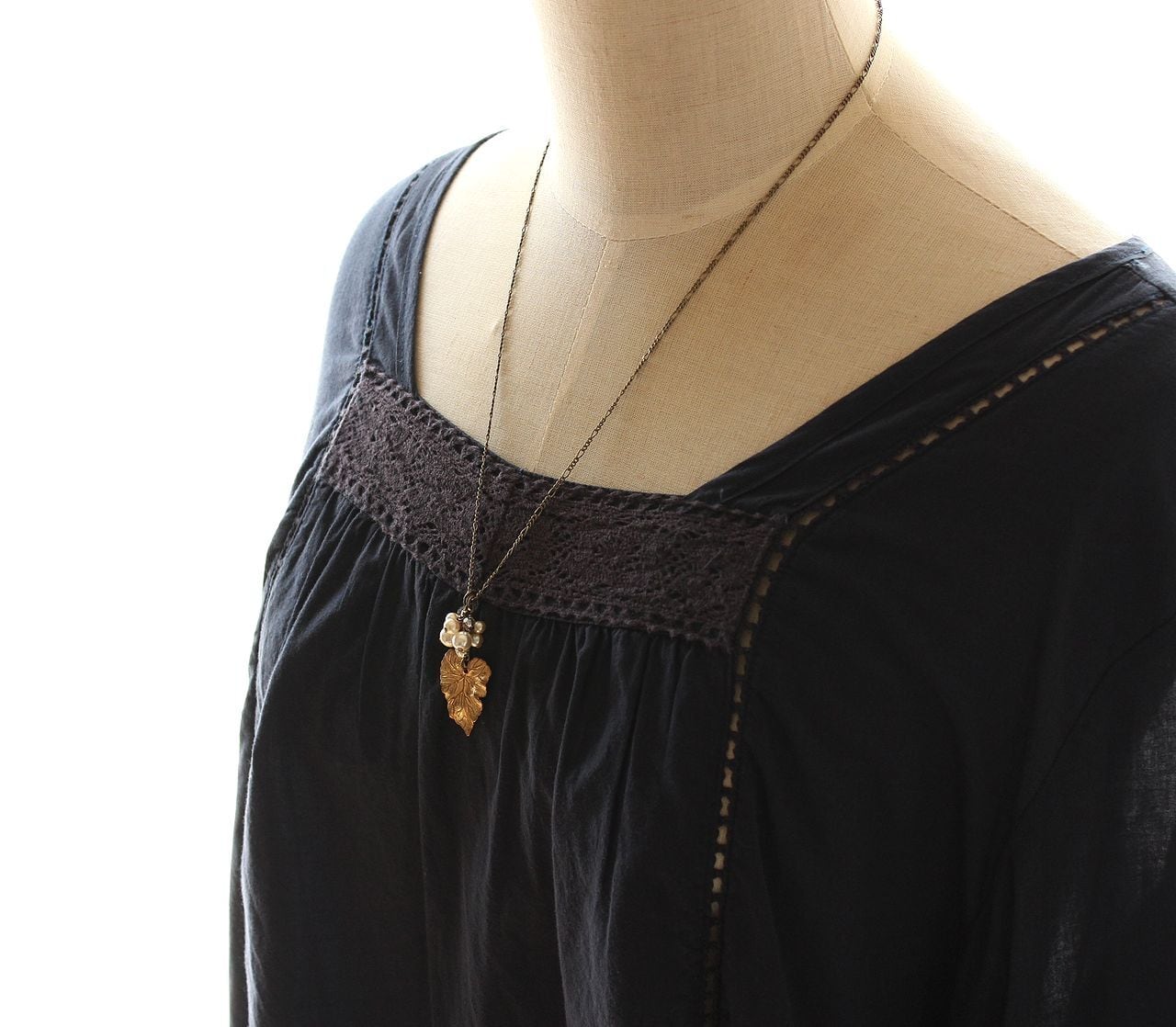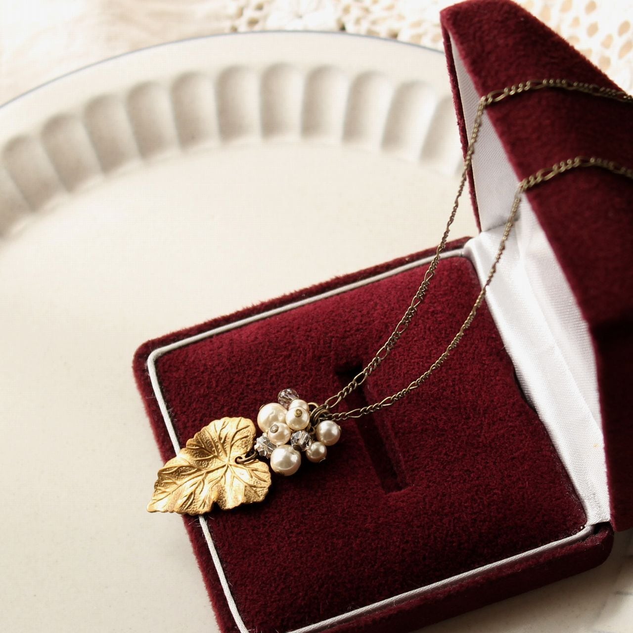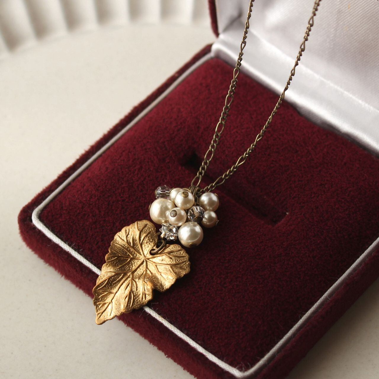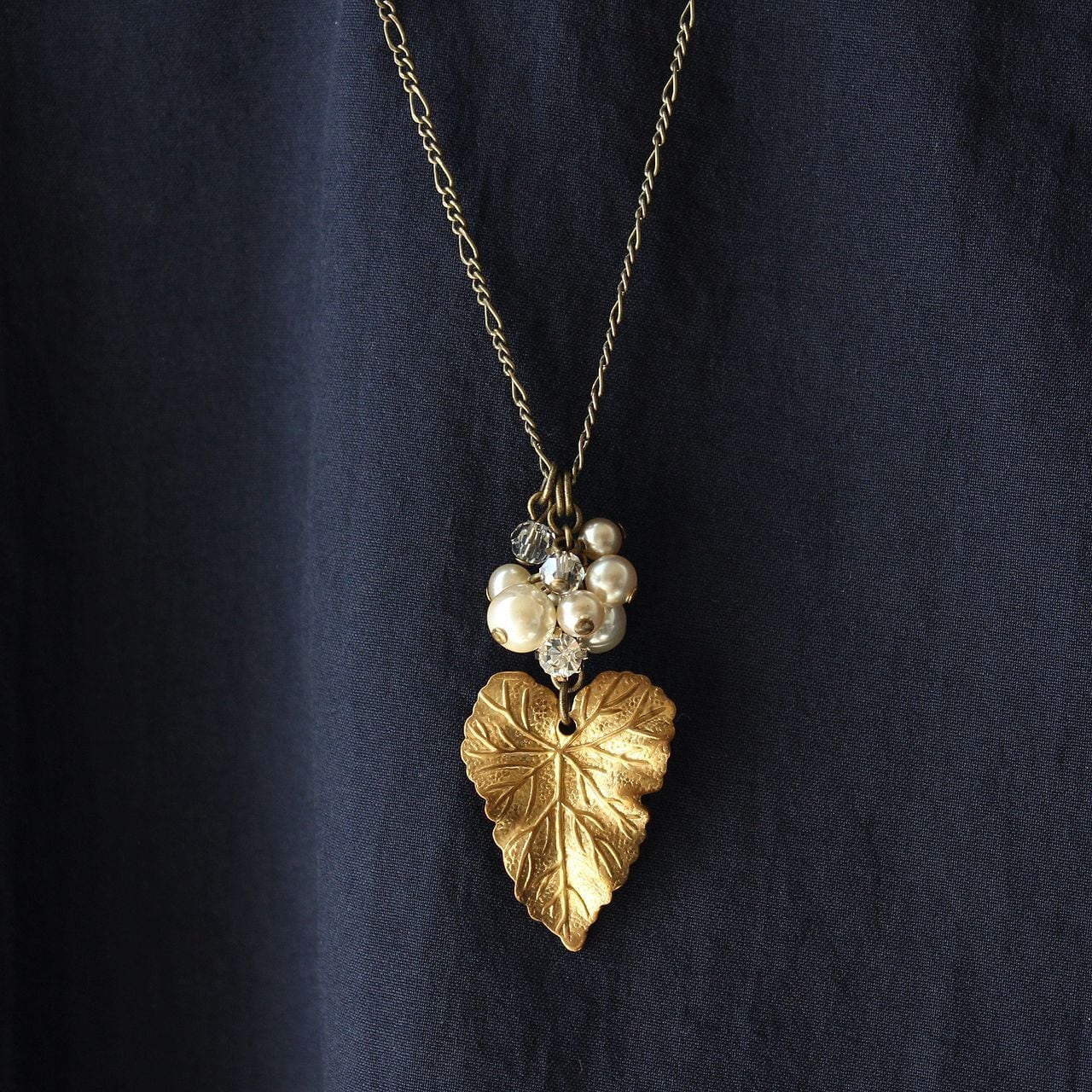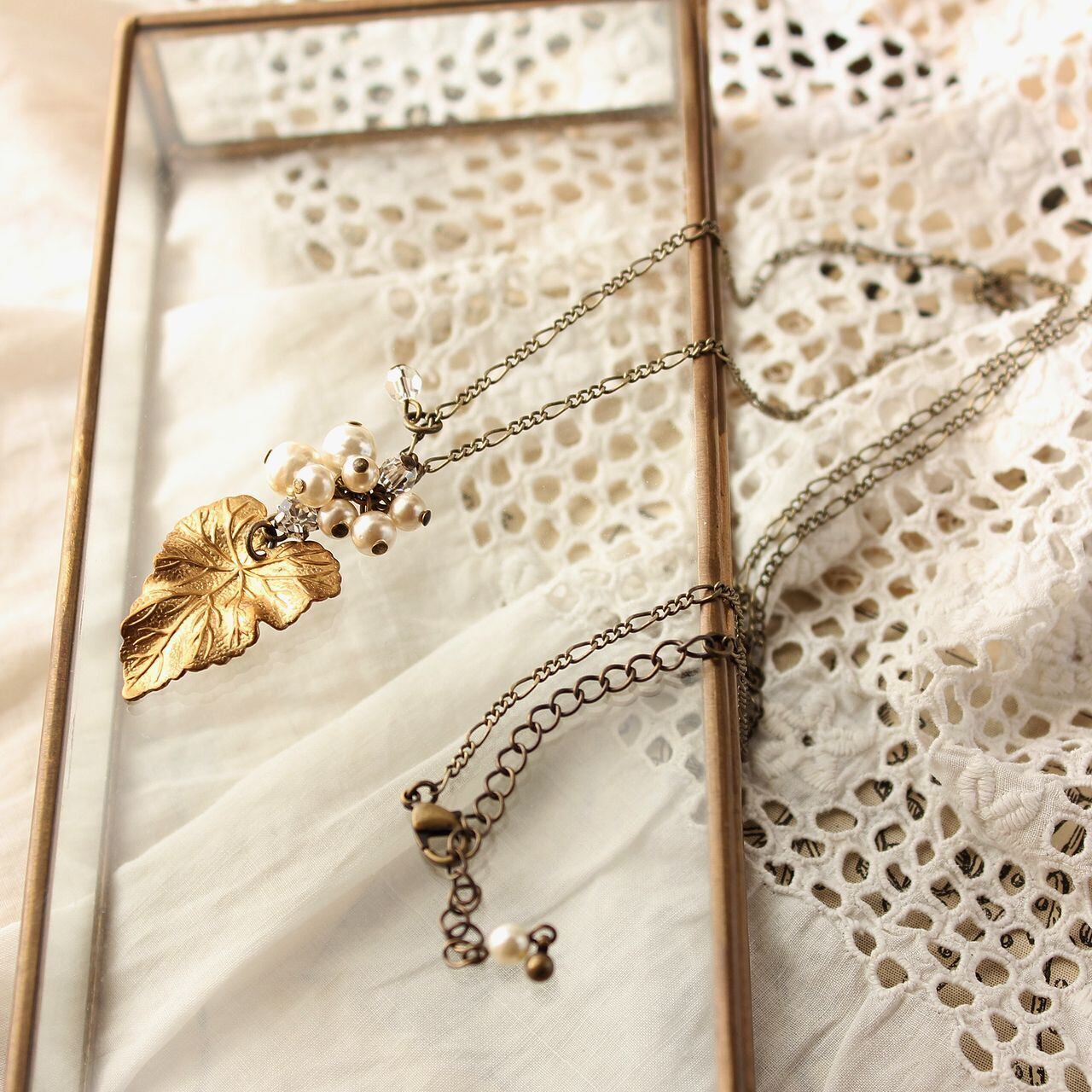 真鍮リーフと房のようにあしらったガラスパールが美しい、ヴィンテージスタイル・ネックレスです。
