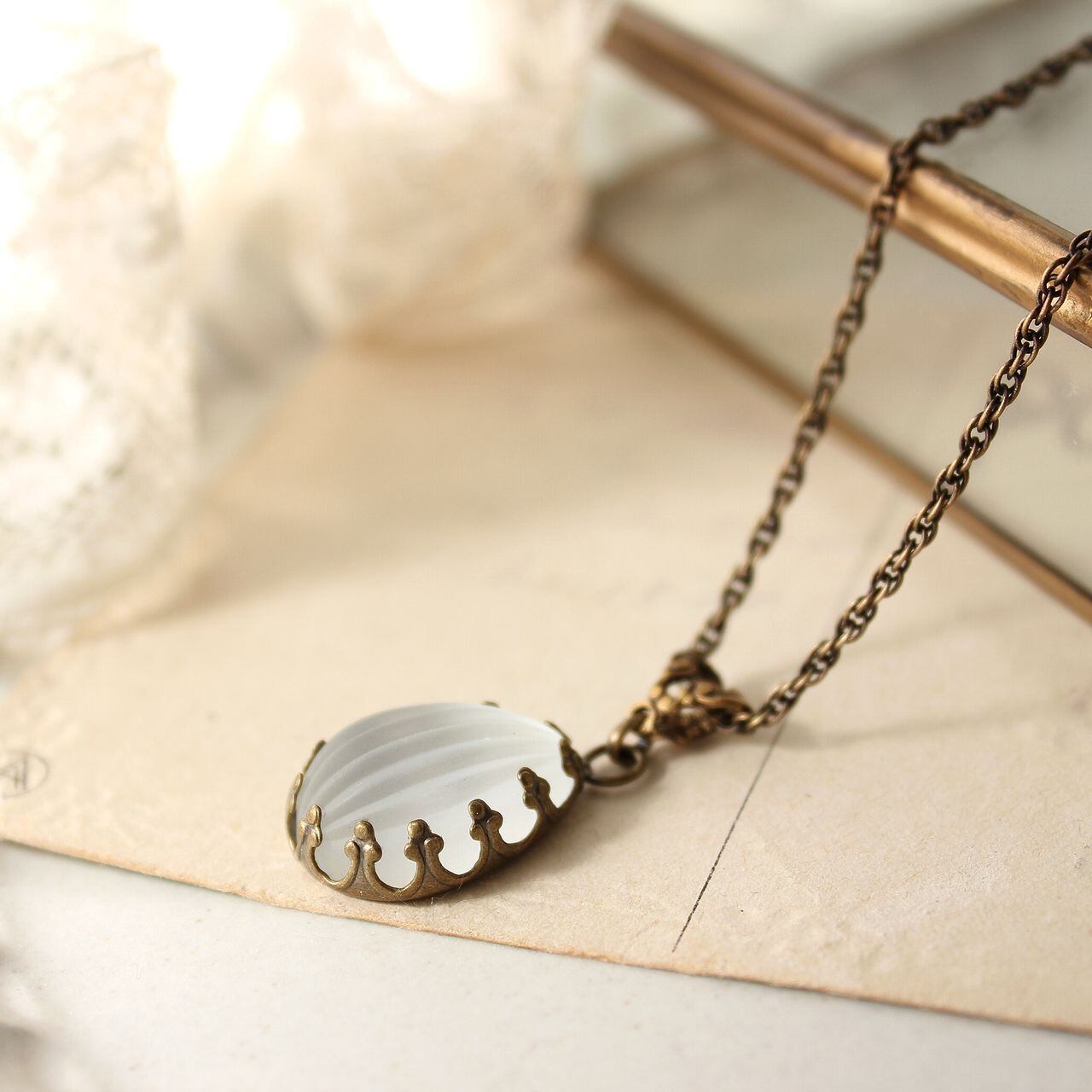 ヴィンテージのフロストグラス・カボションを、フレンチアンティーク・テイストに仕上げたネックレスです。