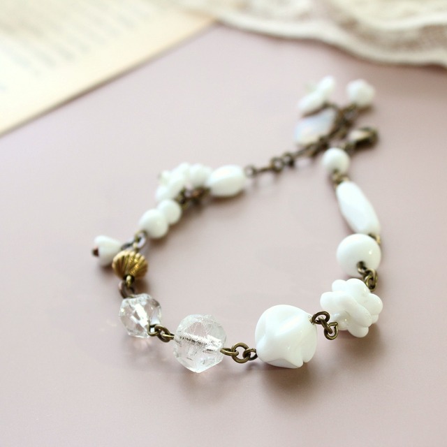 チョークホワイトと、クリアなヴィンテージガラスで仕上げた、レトロテイストなブレスレットです。