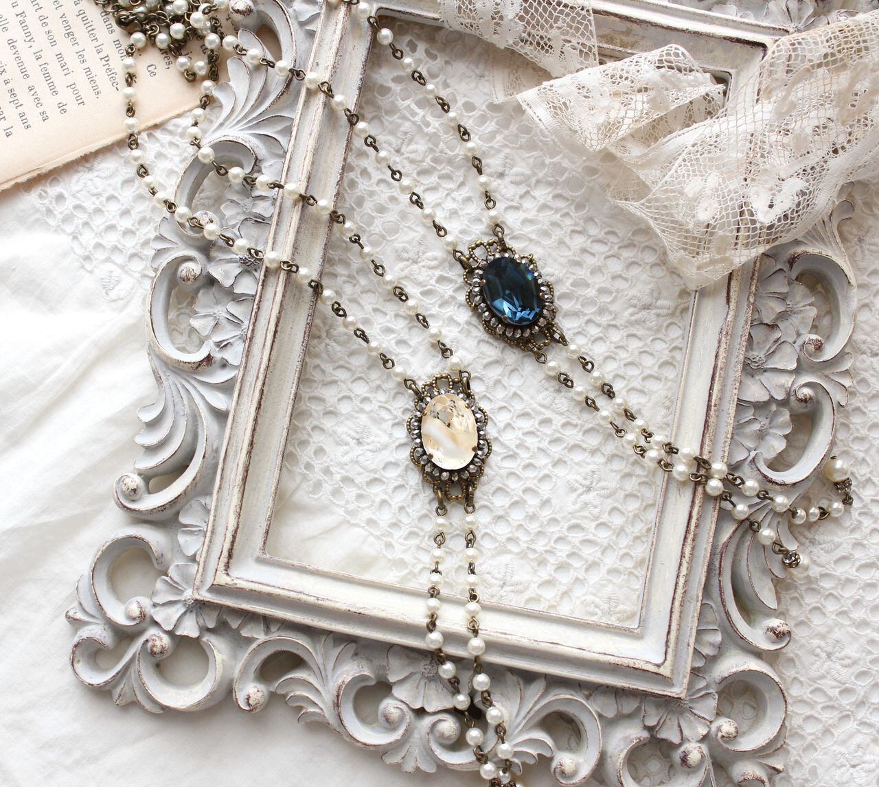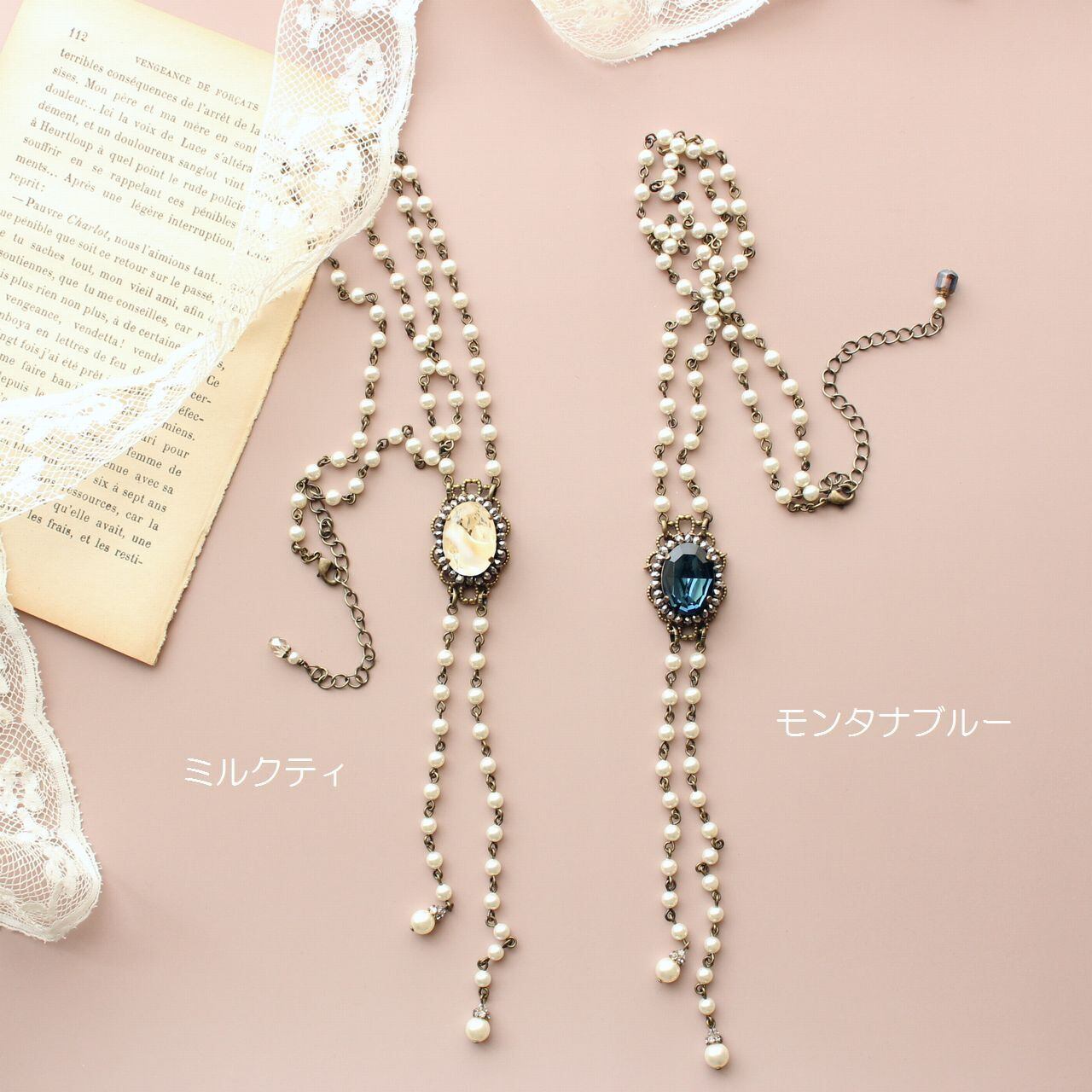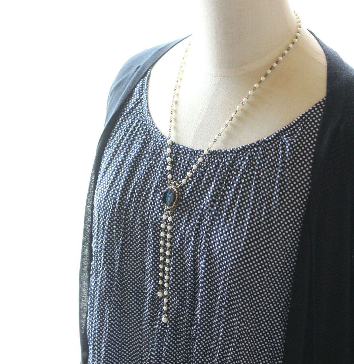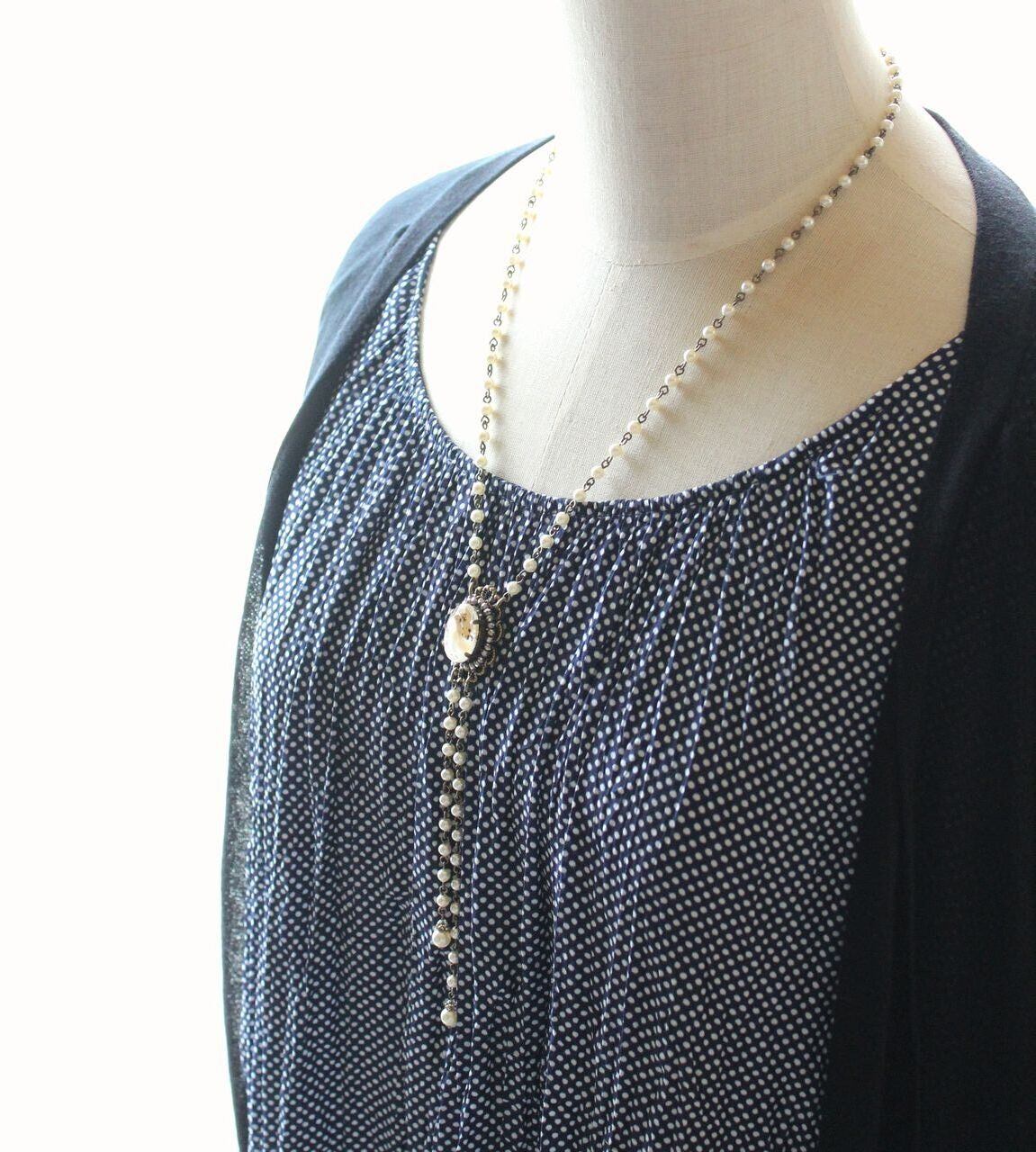 ヴィンテージのグラスストーンとガラスパール、優美にゆれるラインを描く、アンティークムードたっぷりなネックレスです。