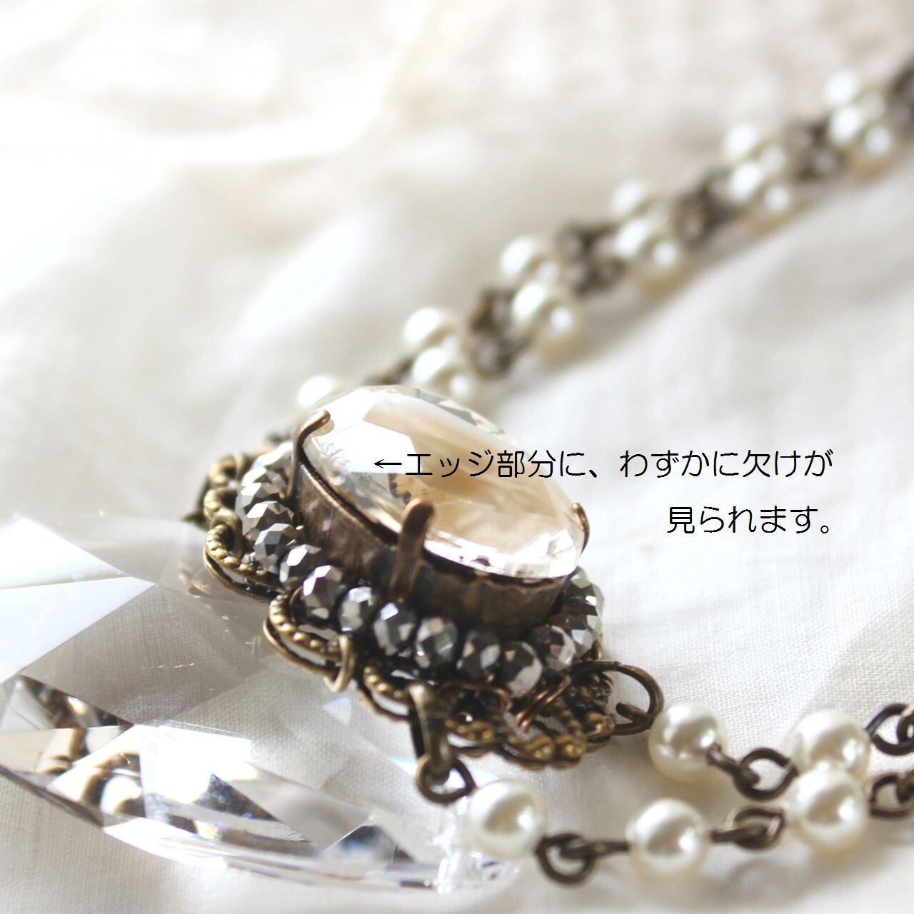 上品に煌めくヴィンテージのグラスストーンは、海外から取り寄せたもの。カットが入ったガラスビーズで取り巻き、ネックレスの先端には、小さなスワロフスキーとラインストーンロンデルを。