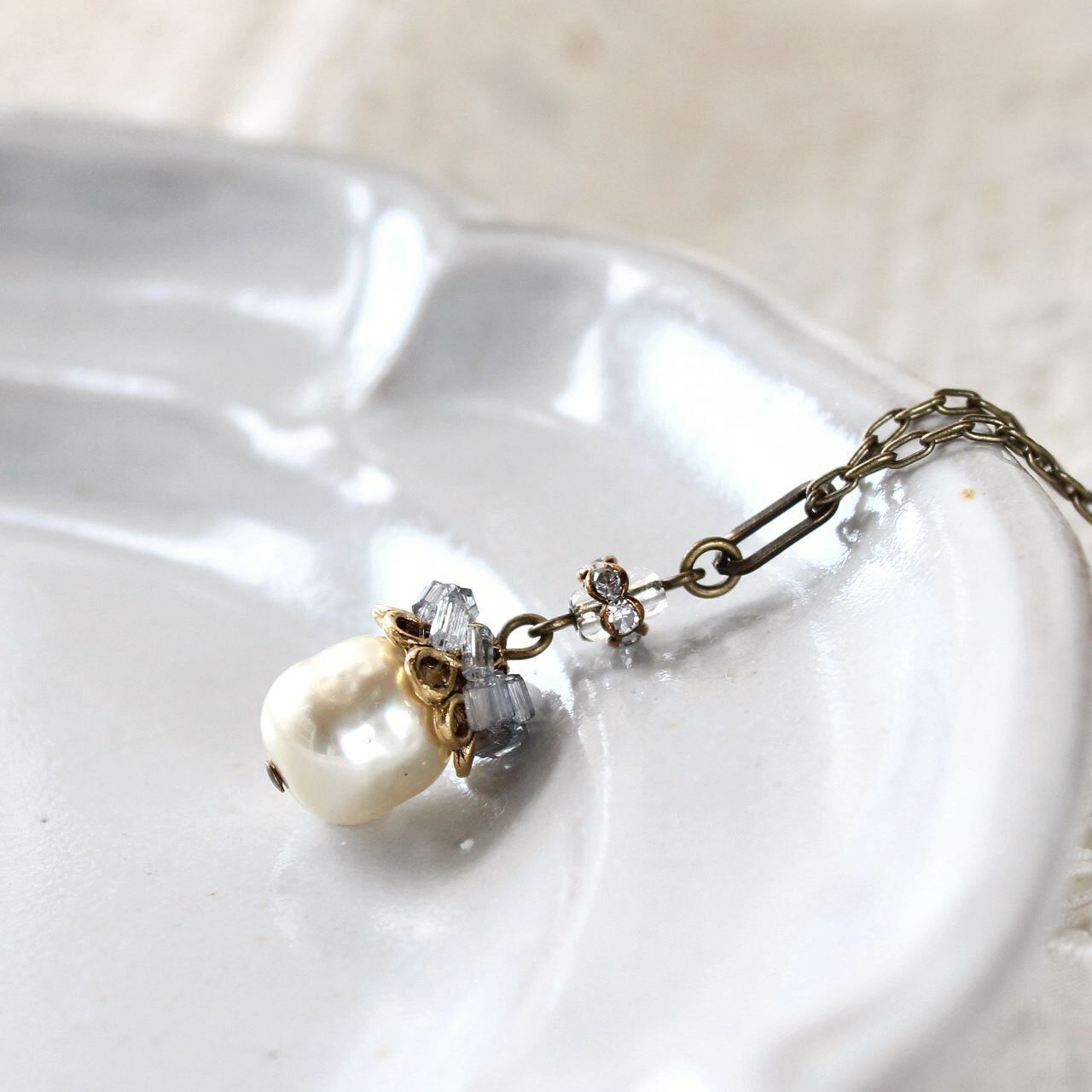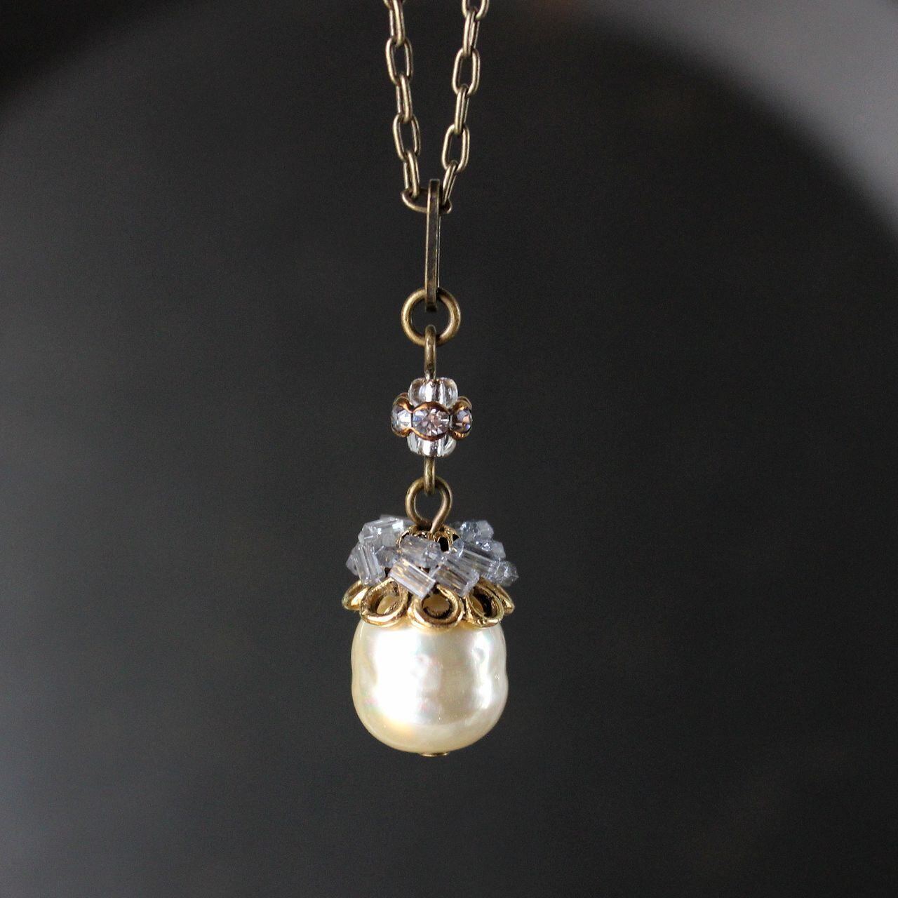 こちらは、ヴィンテージ・コスチュームジュエリーの、タペストリーワークという技法を取り入れています。エレガントなバロックパールにブルーのビーズワークが、可愛らしいムード。