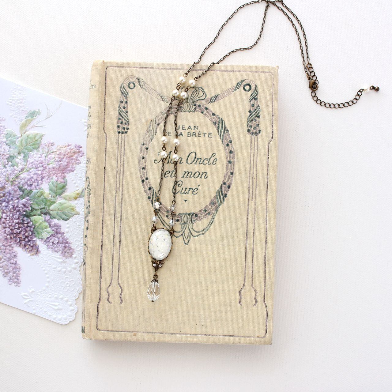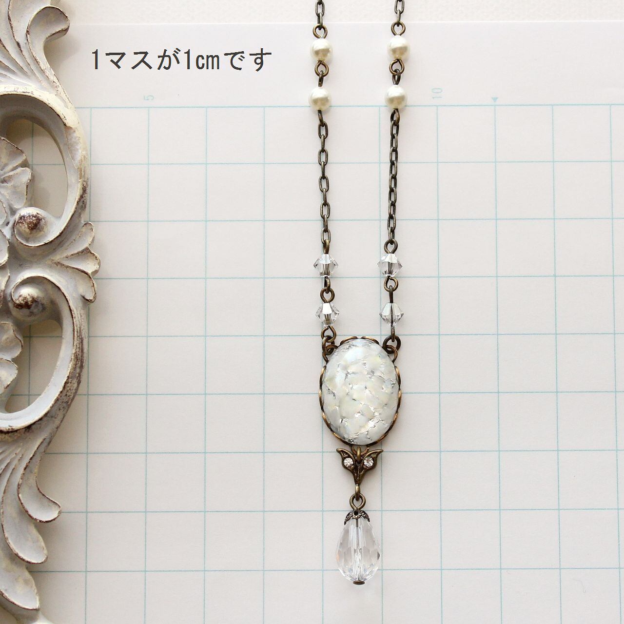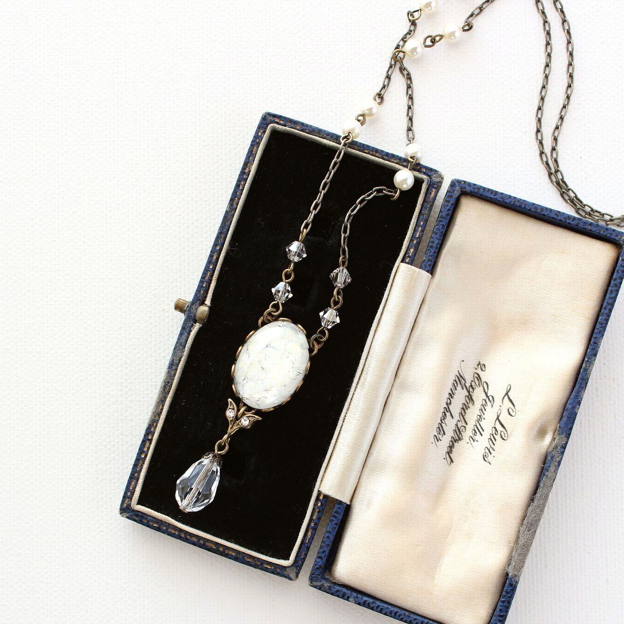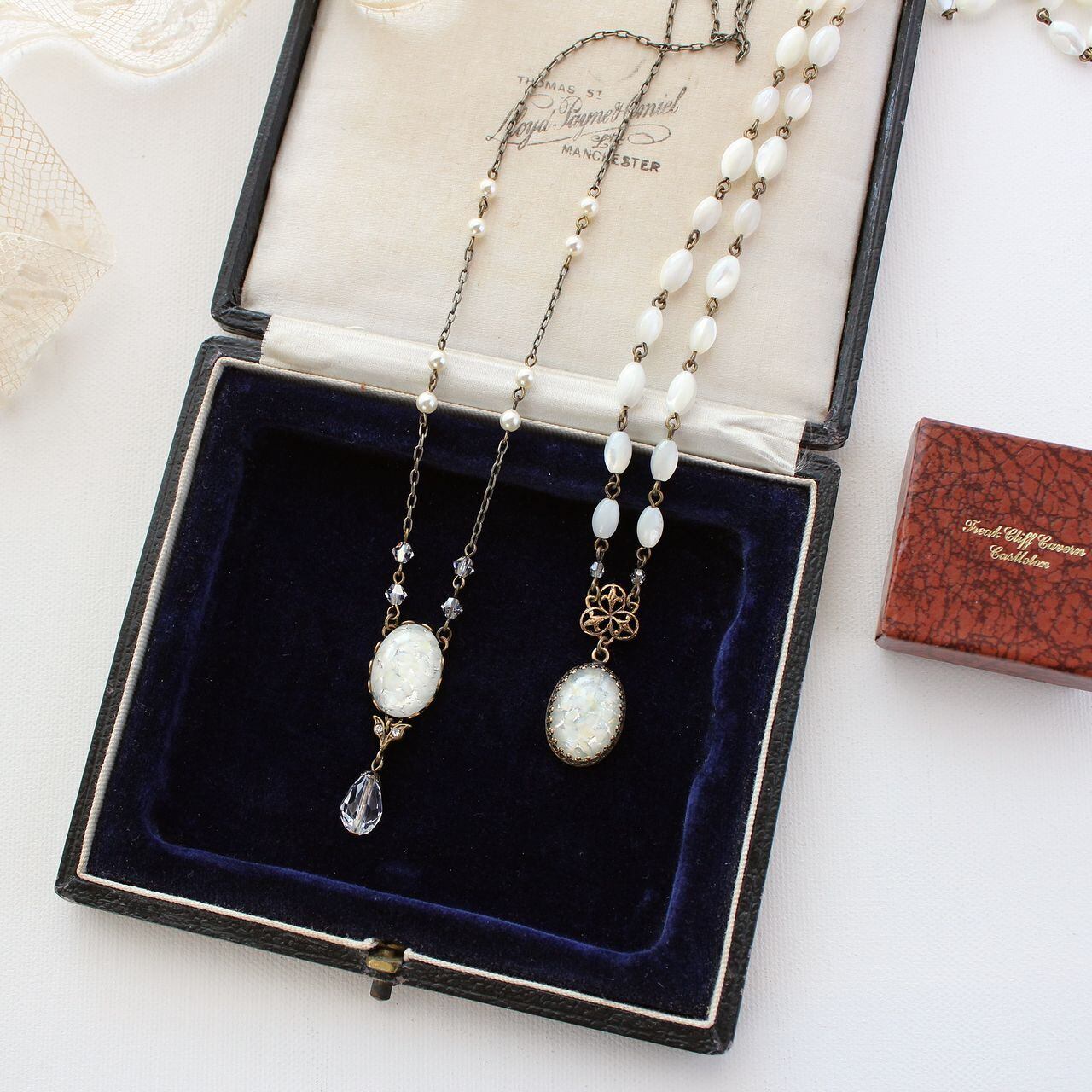 ヴィンテージ・ホワイトオパール・グラスカボションにドロップ型のクリアガラスを揺らせた、フェミニンな印象のネックレス。