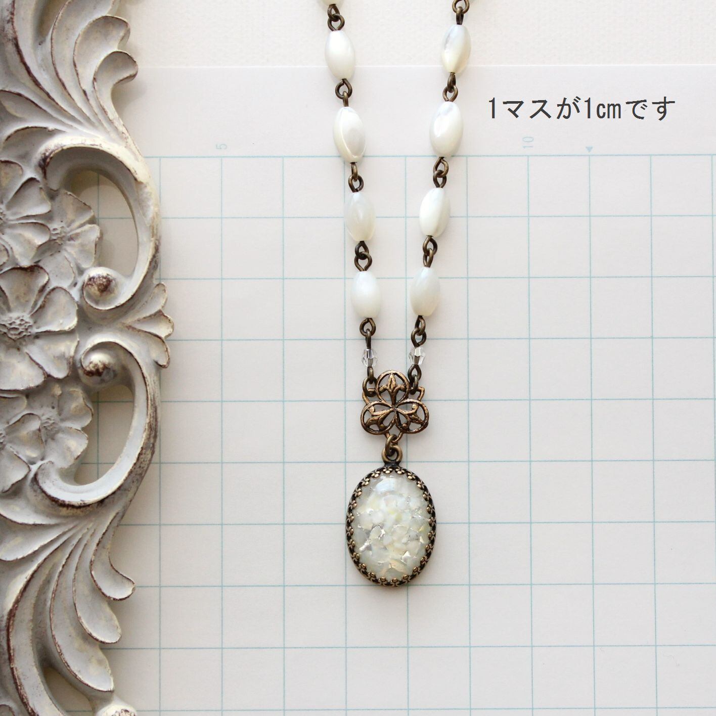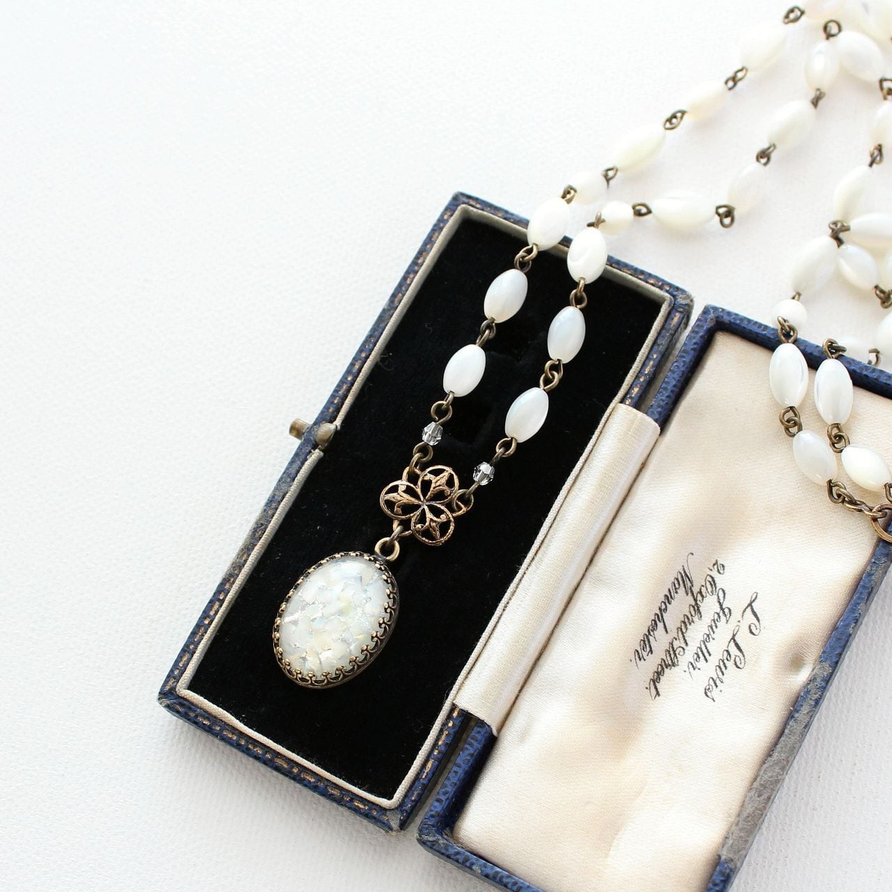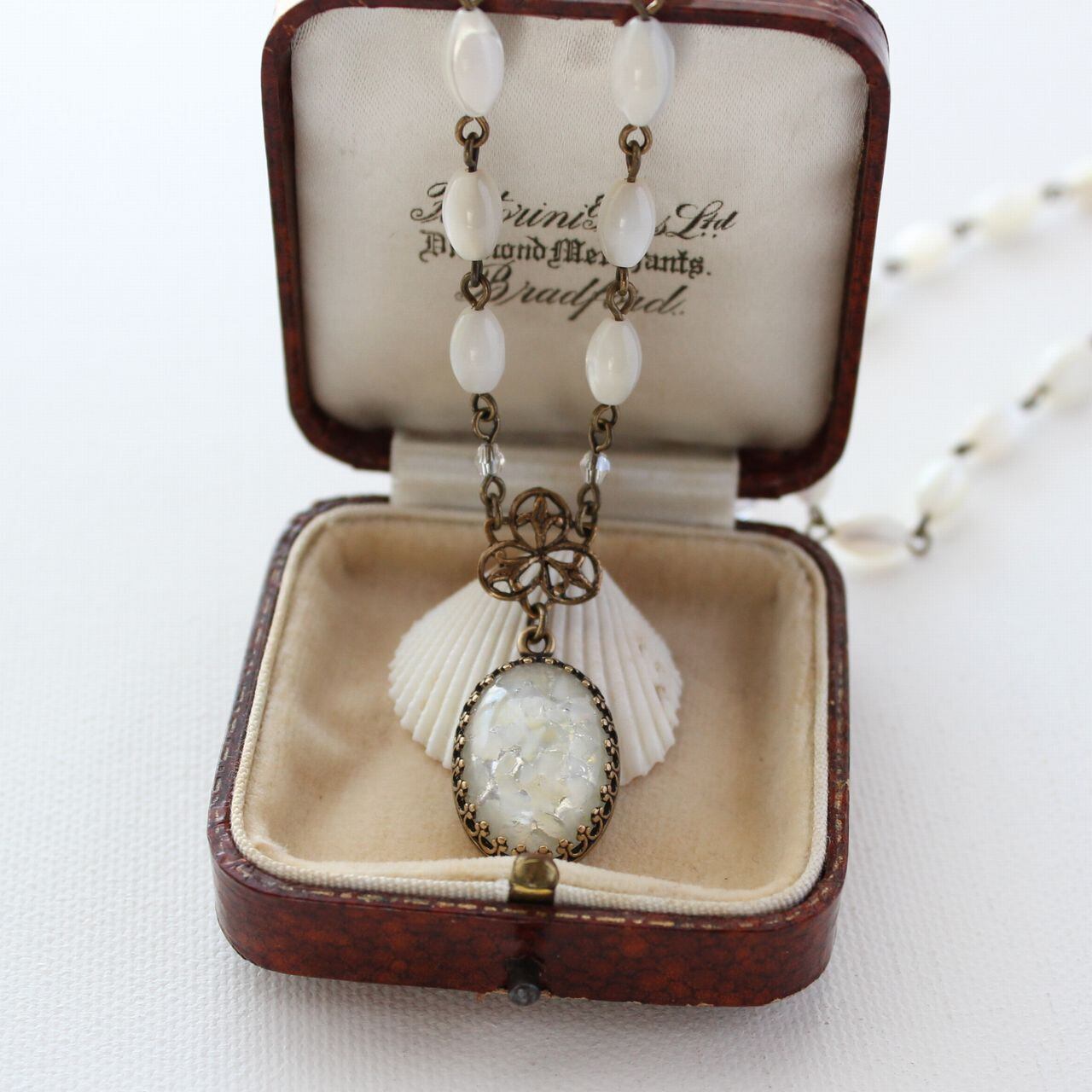 マザーオブパールにヴィンテージ・ホワイトオパール・グラスカボションを揺らせた、上品なネックレス。