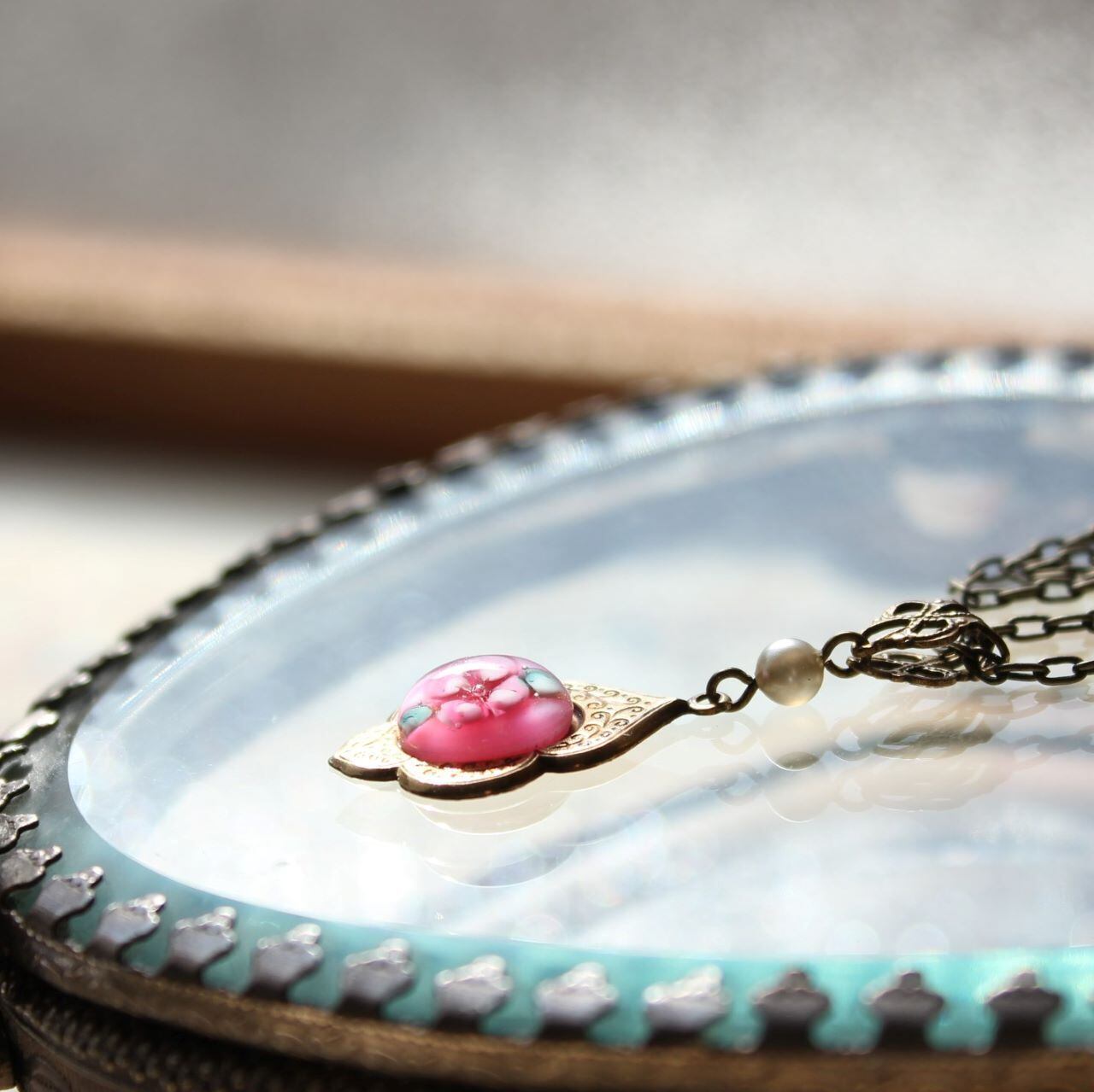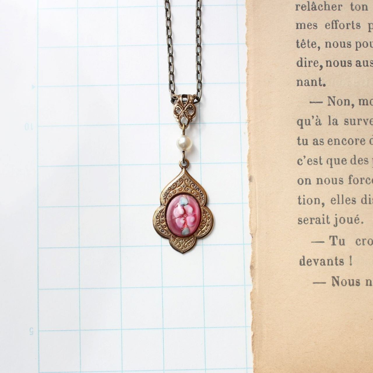 愛らしいローズ色のランプワーク・ガラスカボションに惹かれ、アメリカ・NYから取り寄せたものをネックレスに仕立てました。