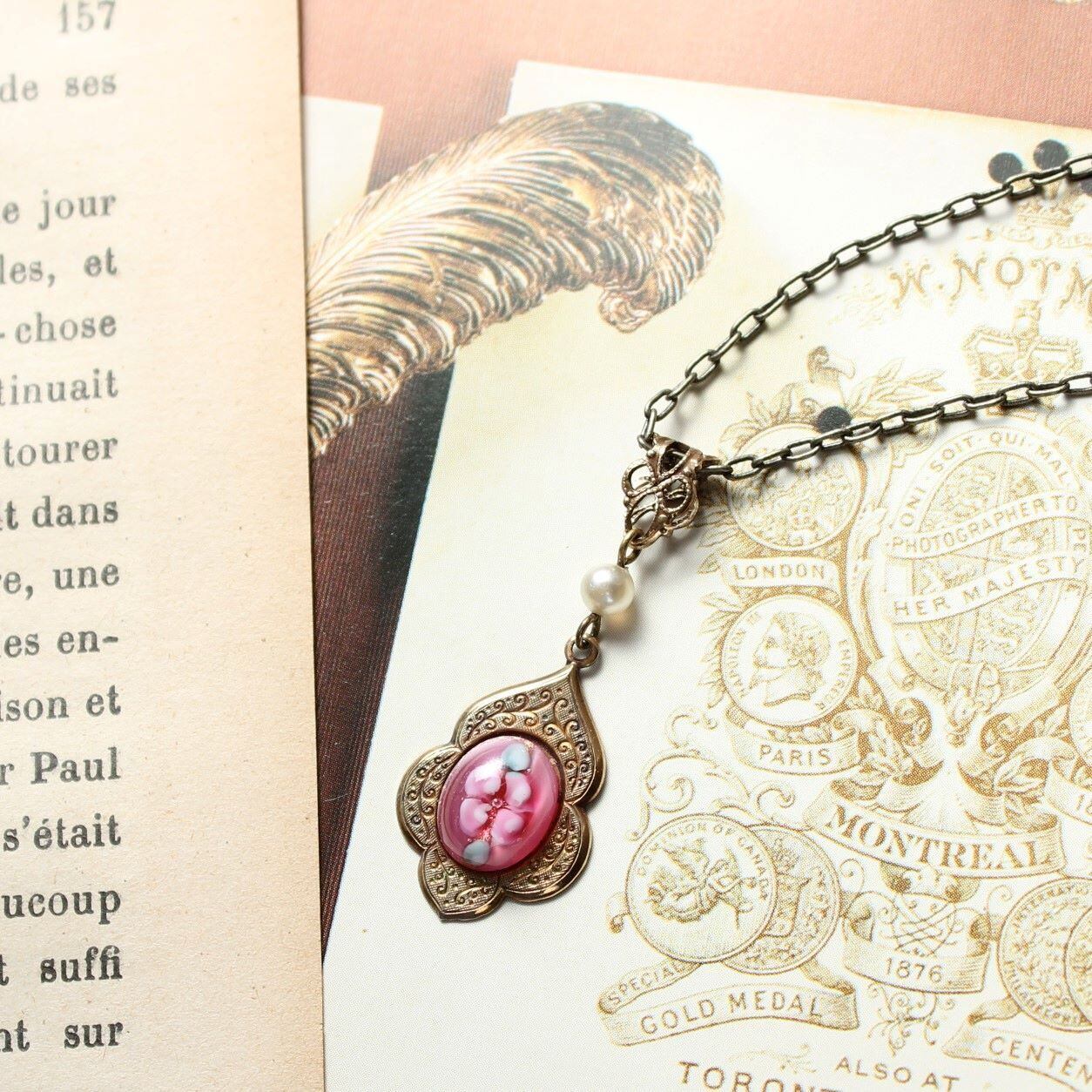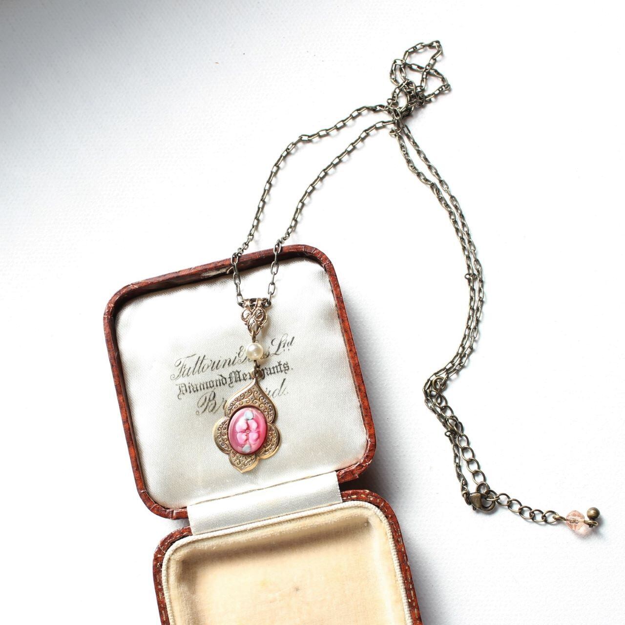 ローズ色のヴィンテージ ランプワーク・ガラス クラシックスタイル・ネックレス ペンダント