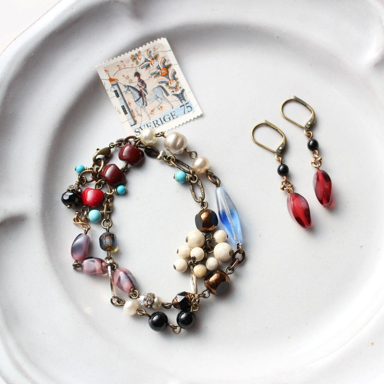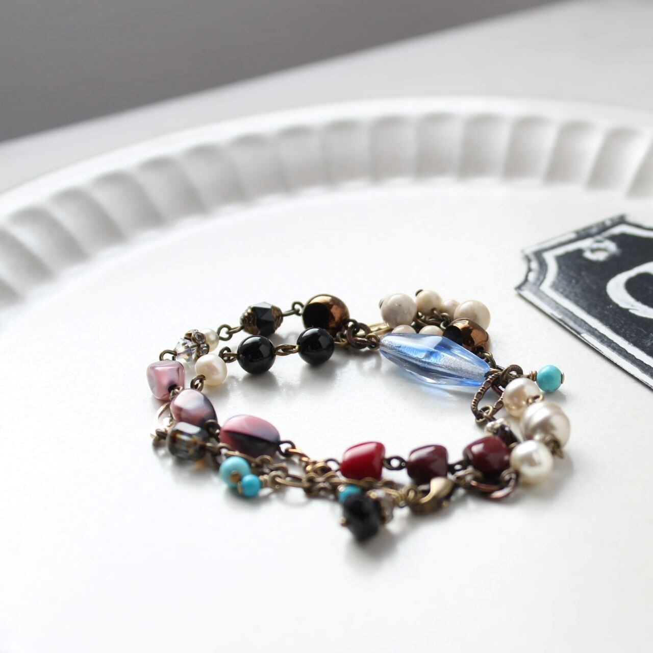 天然石・リバーストーンの房がポイントになっている、こちらのブレスレットは、ヴィンテージビーズやお洒落なフランス、ヨーロッパの洗練されたビーズ、そして、ヴィンテージのガラスビーズ、パーツなど、さまざまな素材をギュッとつなぎ合わせて、オシャレで都会的なイメージのアクセサリーに仕上げました。