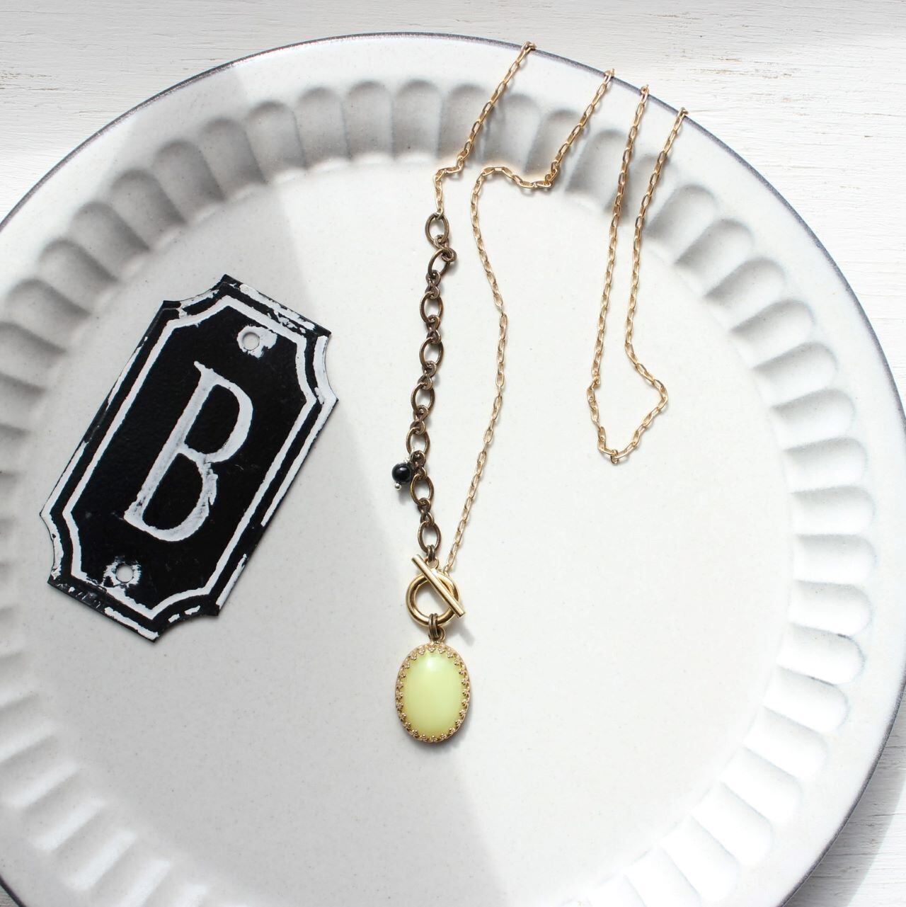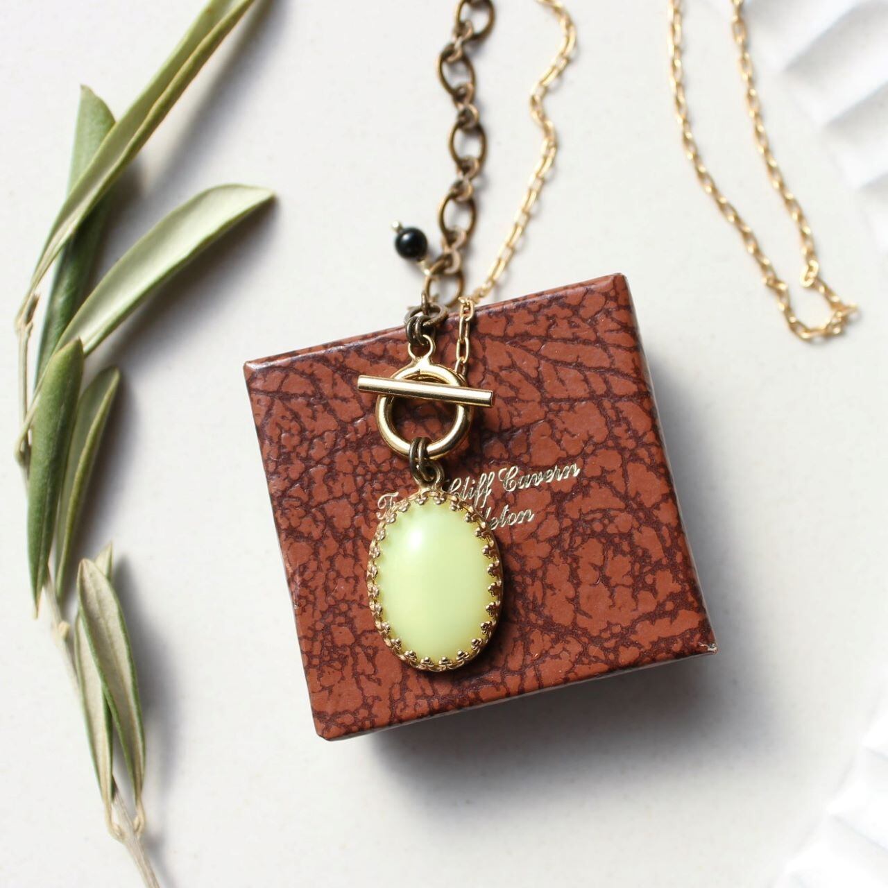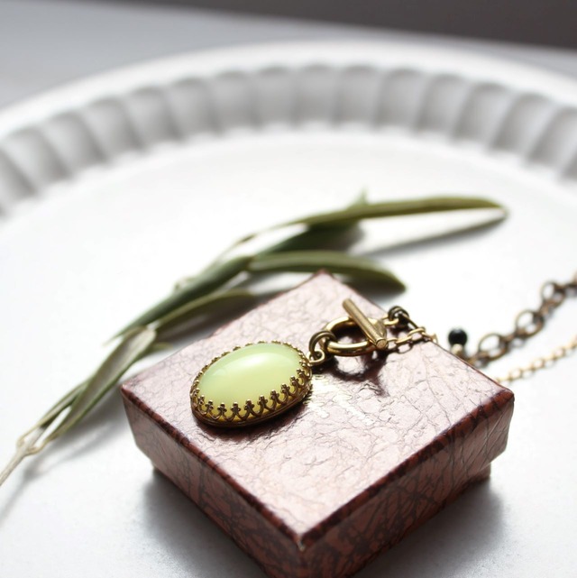 シトロンタルトのような、ちょっと甘酸っぱい色の、ヴィンテージ・ガラスカボション・ネックレスです。