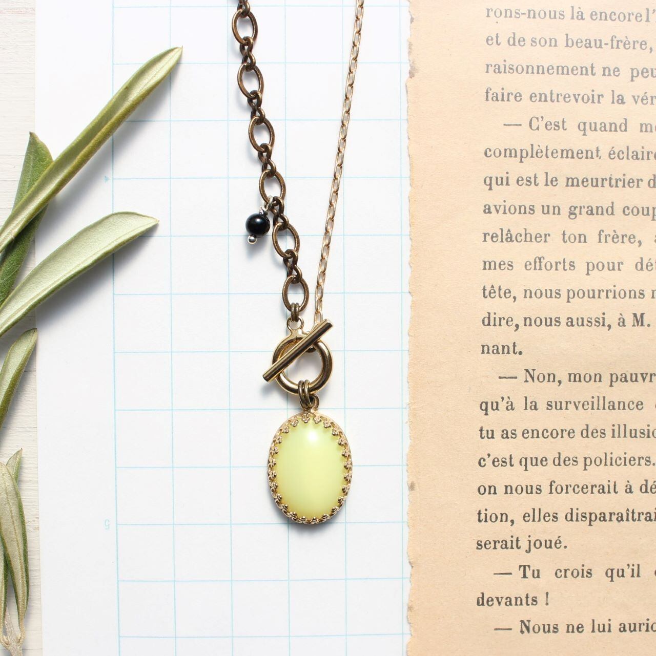 カフェで シトロンタルト ヴィンテージ・ガラス カボションとオニキスのネックレス
