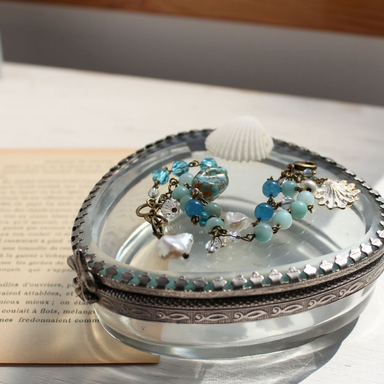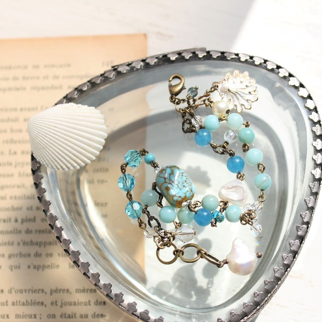 さまざまなブルーを集めて、さざ波の音が聞こえてきそうな、そんな、ちょっとロマンティックに仕上げたブレスレットです。