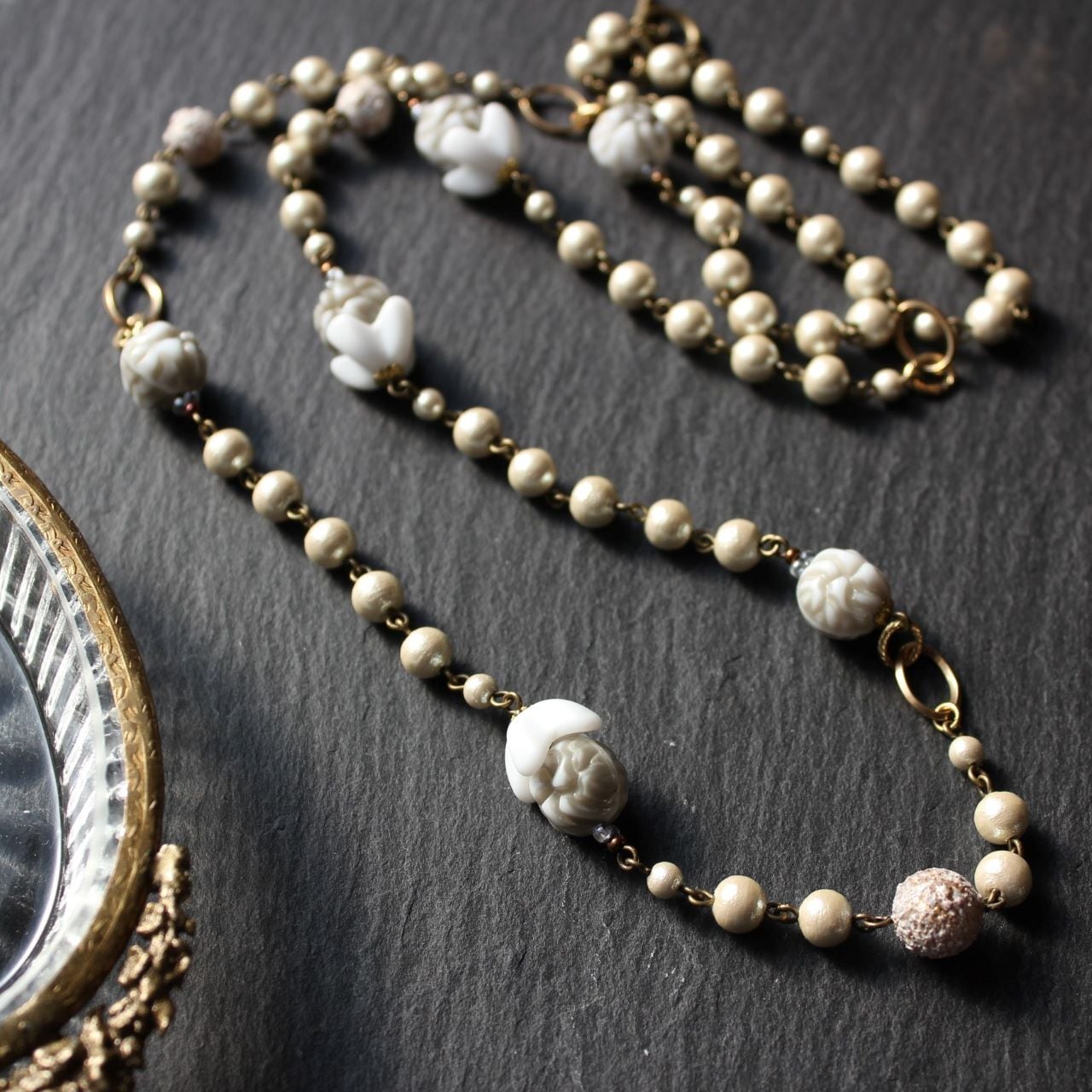 ドイツ・お花のような実のような ヴィンテージビーズとコットンパールのロングネックレス コスチュームジュエリー