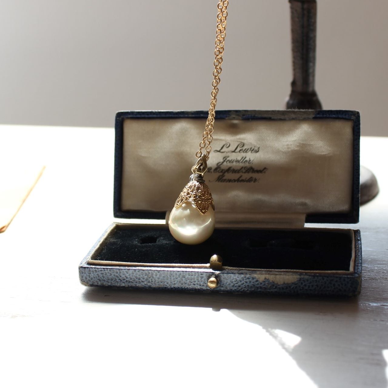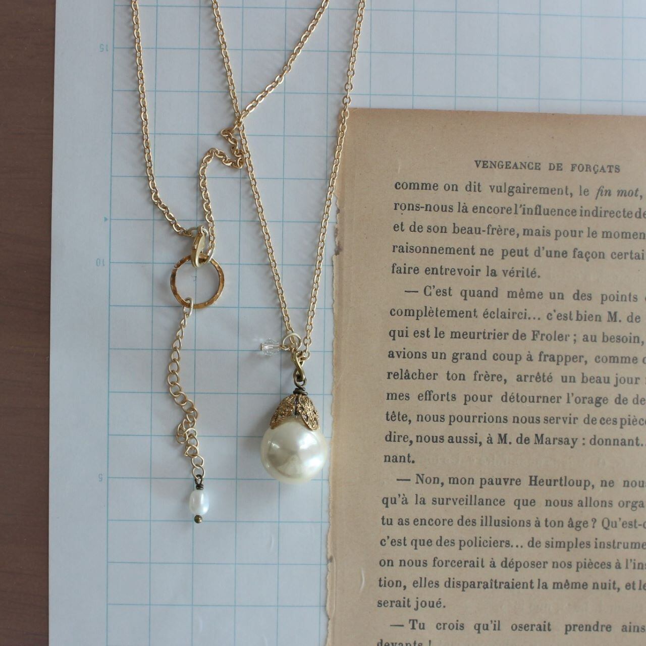 こちらは、バロックガラスパールと、ヴィンテージの真鍮ビーズキャップの組み合わせが、心ときめくペンダント・ネックレスです。