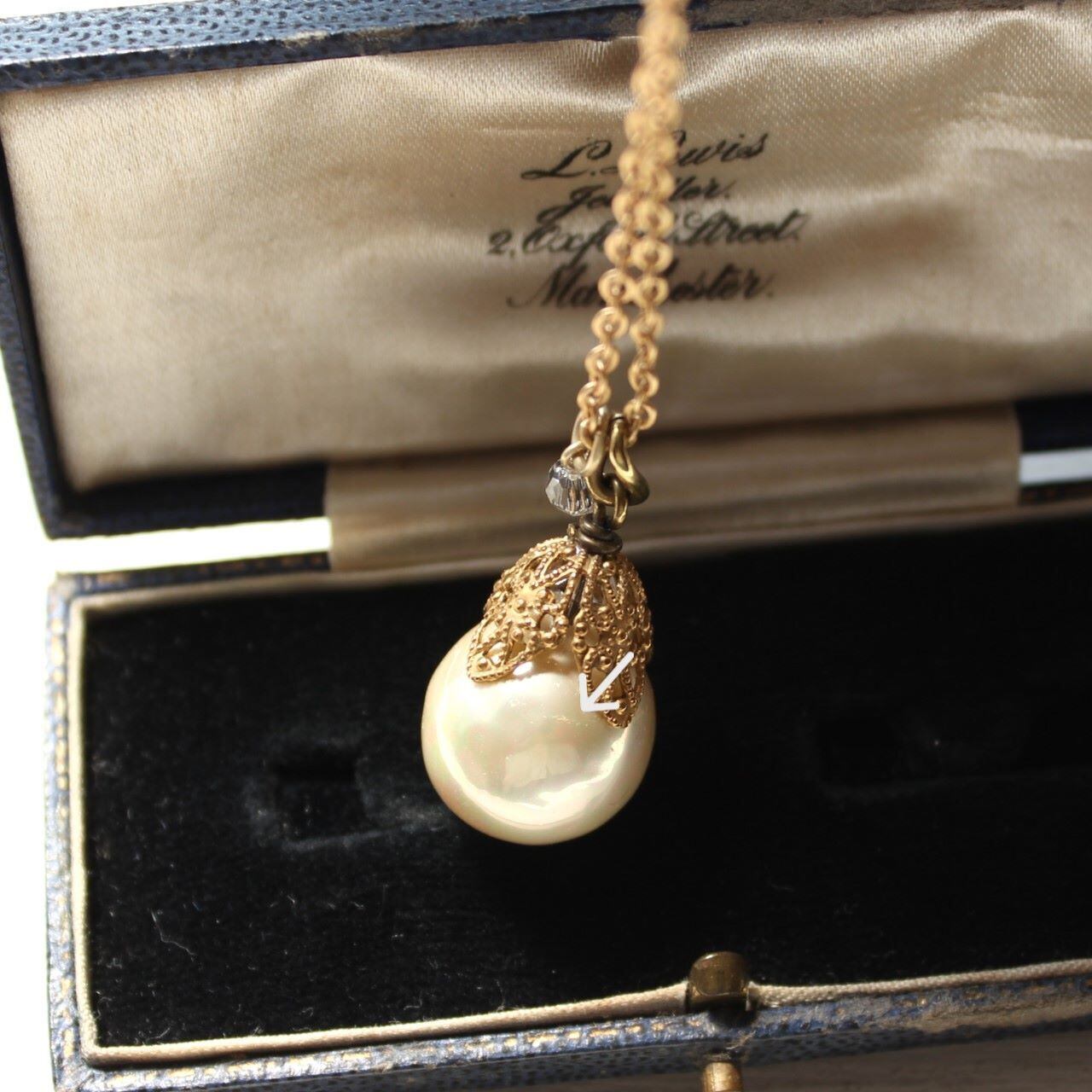 ※ ビーズキャップの尖った部分とガラスパール表面が当たるあたり、パールの表面が、スレたような目立たない細かいキズが、いくらかついています。(7枚目の画像)ルーペでチェックして見たものですので、お使いになる分にはほとんどわからないと思います。