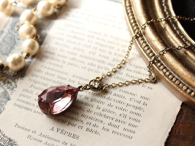ロマンティックなローズ色のグラスストーンを使ったネックレス。