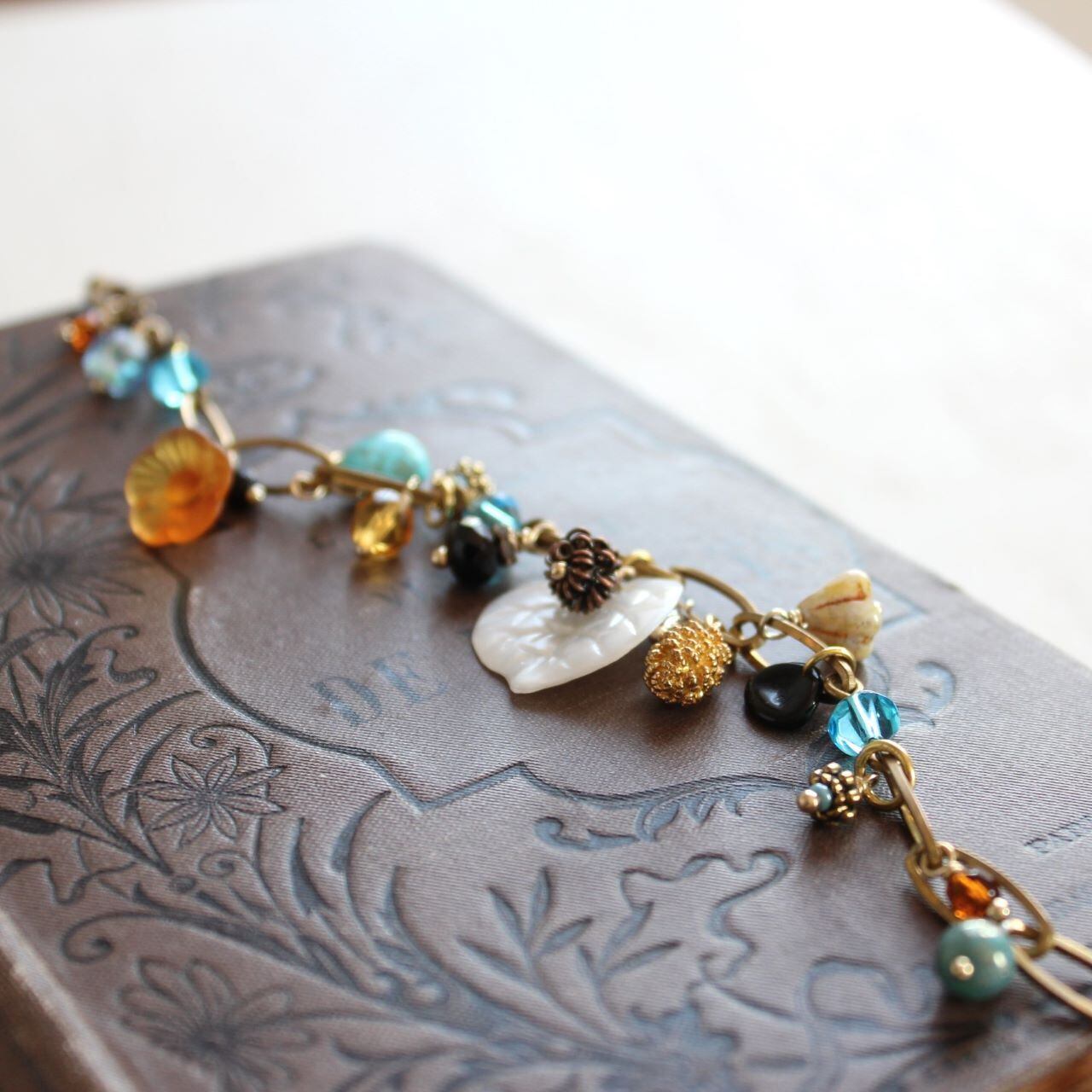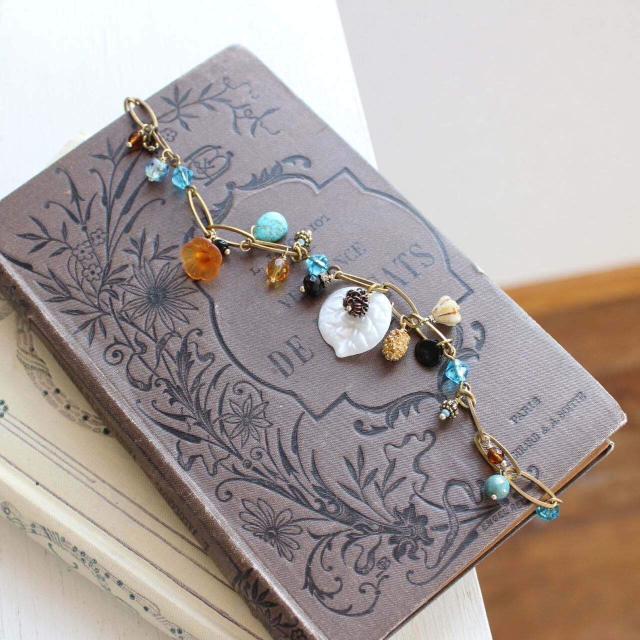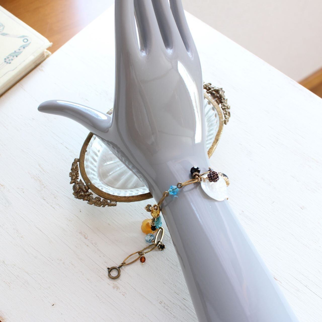 趣のあるヴィンテージチェーンに、いろいろな素材をジャラっと揺らせた、レトロシックな色合いのブレスレットです。